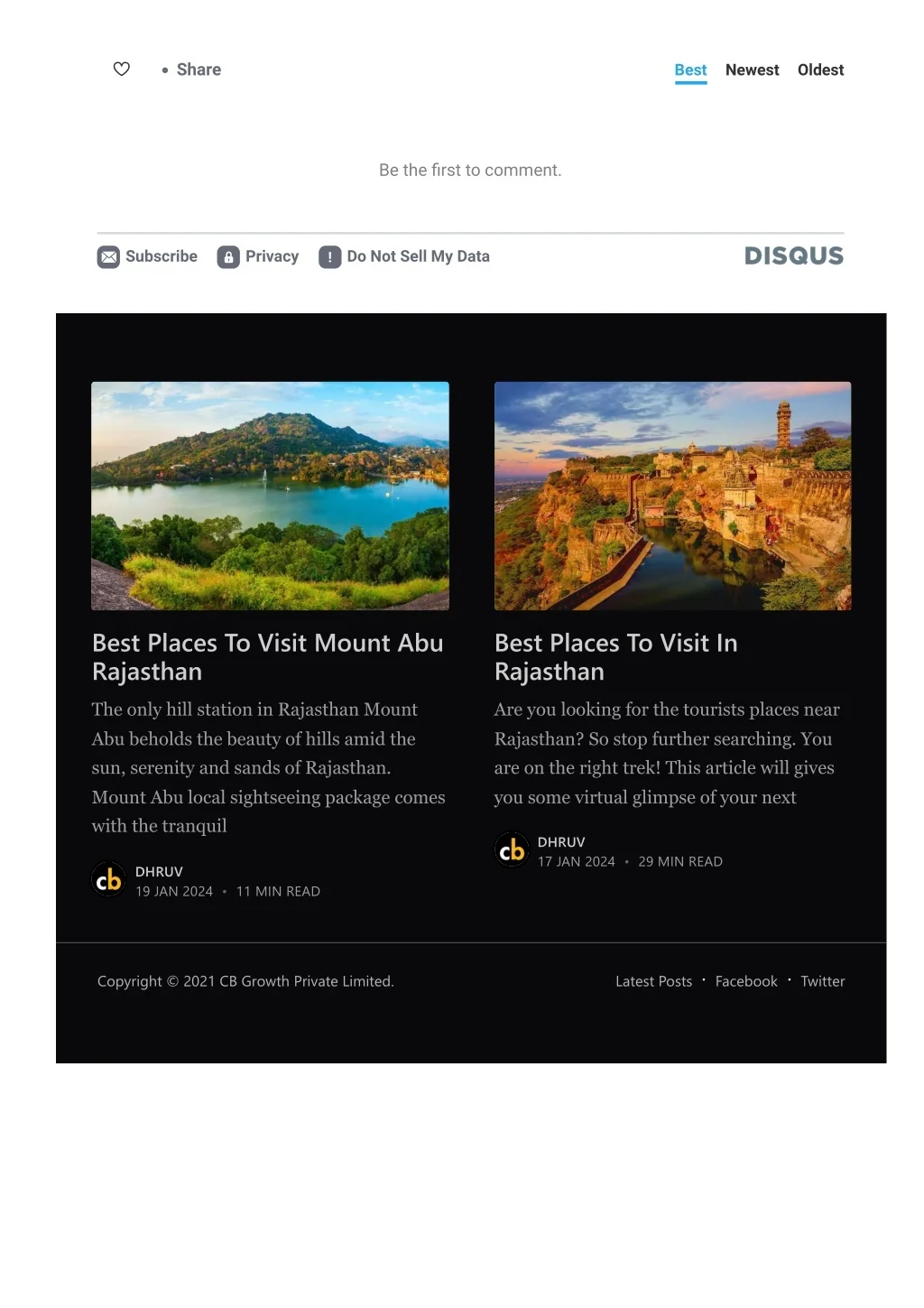 Share Best Newest Oldest Be the ?rst to comment. Subscribe Privacy Do Not Sell My Data Best Places To Visit Mount Abu Rajasthan Best Places To Visit In Rajasthan The only hill station in Rajasthan Mount Abu beholds the beauty of hills amid the sun, serenity and sands of Rajasthan. Mount Abu local sightseeing package comes with the tranquil Are you looking for the tourists places near Rajasthan? So stop further searching. You are on the right trek! This article will gives you some virtual glimpse of your next DHRUV 17 JAN 2024 • 29 MIN READ DHRUV 19 JAN 2024 • 11 MIN READ Copyright © 2021 CB Growth Private Limited. Latest Posts Facebook Twitter