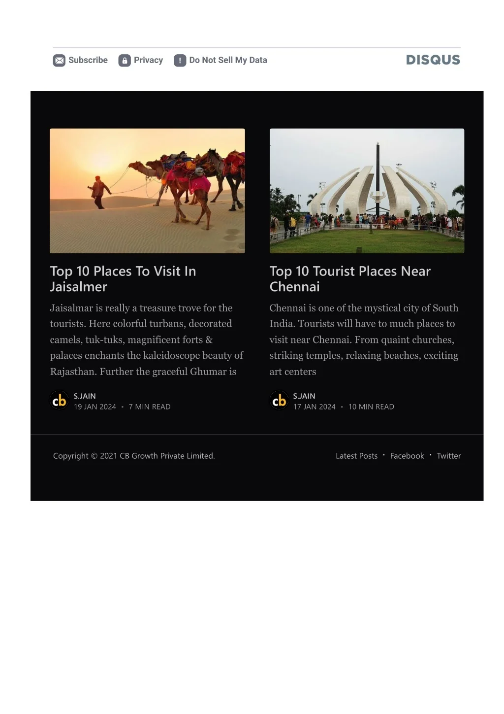Subscribe Privacy Do Not Sell My Data Top 10 Places To Visit In Jaisalmer Top 10 Tourist Places Near Chennai Jaisalmar is really a treasure trove for the tourists. Here colorful turbans, decorated camels, tuk-tuks, magnificent forts & palaces enchants the kaleidoscope beauty of Rajasthan. Further the graceful Ghumar is Chennai is one of the mystical city of South India. Tourists will have to much places to visit near Chennai. From quaint churches, striking temples, relaxing beaches, exciting art centers S.JAIN 19 JAN 2024 S.JAIN 17 JAN 2024 • 7 MIN READ • 10 MIN READ Copyright © 2021 CB Growth Private Limited. Latest Posts Facebook Twitter
