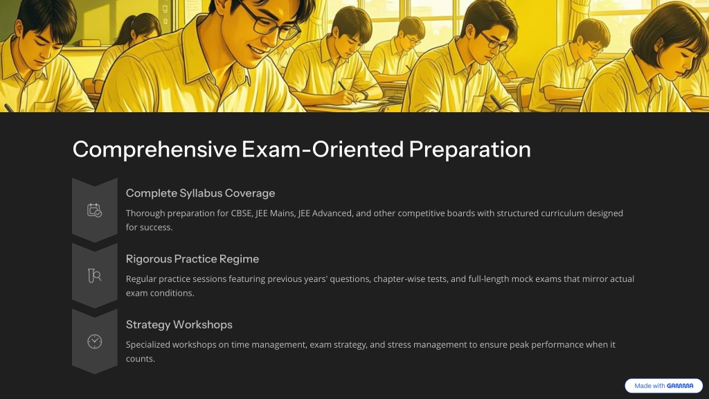 Comprehensive Exam-Oriented Preparation Complete Syllabus Coverage Thorough preparation for CBSE, JEE Mains, JEE Advanced, and other competitive boards with structured curriculum designed for success. Rigorous Practice Regime Regular practice sessions featuring previous years' questions, chapter-wise tests, and full-length mock exams that mirror actual exam conditions. Strategy Workshops Specialized workshops on time management, exam strategy, and stress management to ensure peak performance when it counts.