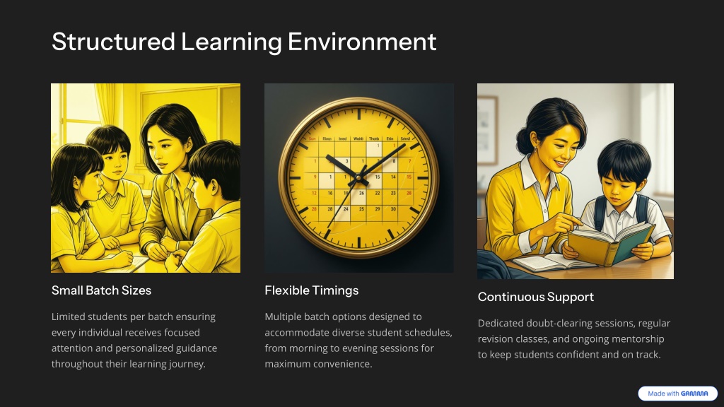 Structured Learning Environment Small Batch Sizes Flexible Timings Continuous Support Limited students per batch ensuring every individual receives focused attention and personalized guidance throughout their learning journey. Multiple batch options designed to accommodate diverse student schedules, from morning to evening sessions for maximum convenience. Dedicated doubt-clearing sessions, regular revision classes, and ongoing mentorship to keep students confident and on track.