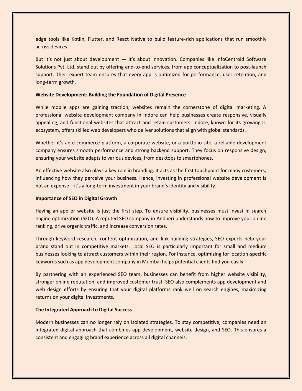 2. edge tools like Kotlin, Flutter, and React Native to build feature-rich applications that run smoothly across devices. But it’s not just about development —it’s about innovation. Companies like InfoCentroid Software Solutions Pvt. Ltd. stand out by offering end-to-end services, from app conceptualization to post-launch support. Their expert team ensures that every app is optimized for performance, user retention, and long-term growth. Website Development: Building the Foundation of Digital Presence While mobile apps are gaining traction, websites remain the cornerstone of digital marketing. A professional website development company in Indore can help businesses create responsive, visually appealing, and functional websites that attract and retain customers. Indore, known for its growing IT ecosystem, offers skilled web developers who deliver solutions that align with global standards. Whether it’s an e-commerce platform, a corporate website, or a portfolio site, a reliable development company ensures smooth performance and strong backend support. They focus on responsive design, ensuring your website adapts to various devices, from desktops to smartphones. An effective website also plays a key role in branding. It acts as the first touchpoint for many customers, influencing how they perceive your business. Hence, investing in professional website development is not an expense—it’s a long-term investment in your brand’s identity and visibility. Importance of SEO in Digital Growth Having an app or website is just the first step. To ensure visibility, businesses must invest in search engine optimization (SEO). A reputed SEO company in Andheri understands how to improve your online ranking, drive organic traffic, and increase conversion rates. Through keyword research, content optimization, and link-building strategies, SEO experts help your brand stand out in competitive markets. Local SEO is particularly important for small and medium businesses looking to attract customers within their region. For instance, optimizing for location-specific keywords such as app development company in Mumbai helps potential clients find you easily. By partnering with an experienced SEO team, businesses can benefit from higher website visibility, stronger online reputation, and improved customer trust. SEO also complements app development and web design efforts by ensuring that your digital platforms rank well on search engines, maximizing returns on your digital investments. The Integrated Approach to Digital Success Modern businesses can no longer rely on isolated strategies. To stay competitive, companies need an integrated digital approach that combines app development, website design, and SEO. This ensures a consistent and engaging brand experience across all digital channels.