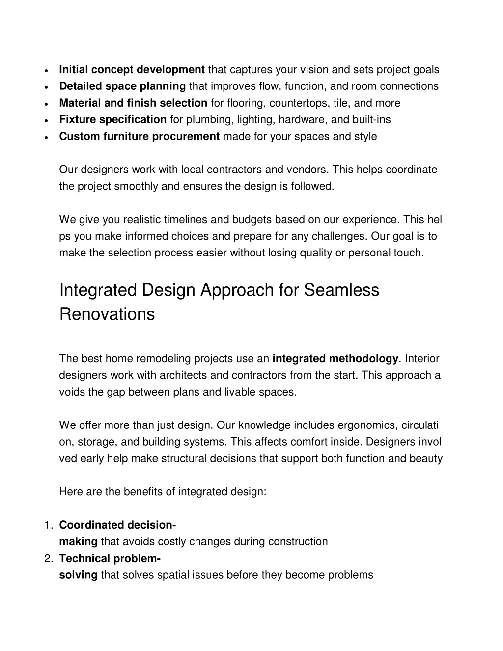 Initial concept development that captures your vision and sets project goals Detailed space planning that improves flow, function, and room connections Material and finish selection for flooring, countertops, tile, and more Fixture specification for plumbing, lighting, hardware, and built-ins Custom furniture procurement made for your spaces and style Our designers work with local contractors and vendors. This helps coordinate the project smoothly and ensures the design is followed. We give you realistic timelines and budgets based on our experience. This hel ps you make informed choices and prepare for any challenges. Our goal is to make the selection process easier without losing quality or personal touch. Integrated Design Approach for Seamless Renovations The best home remodeling projects use an integrated methodology. Interior designers work with architects and contractors from the start. This approach a voids the gap between plans and livable spaces. We offer more than just design. Our knowledge includes ergonomics, circulati on, storage, and building systems. This affects comfort inside. Designers invol ved early help make structural decisions that support both function and beauty Here are the benefits of integrated design: 1. Coordinated decision- making that avoids costly changes during construction 2. Technical problem- solving that solves spatial issues before they become problems