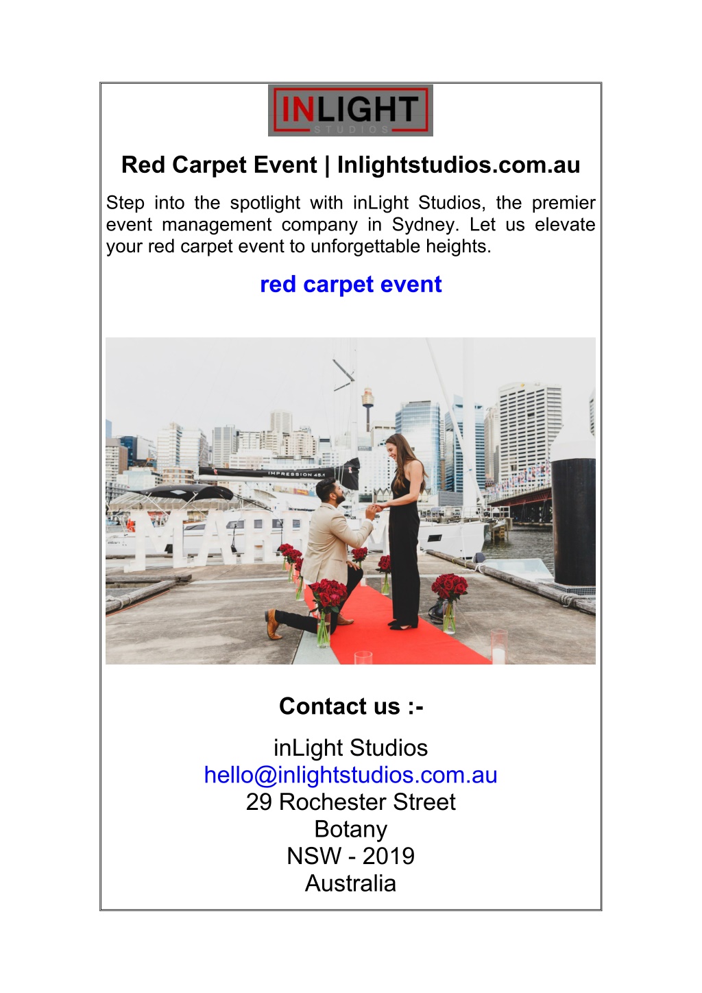 Red Carpet Event | Inlightstudios.com.au Step into the spotlight with inLight Studios, the premier event management company in Sydney. Let us elevate your red carpet event to unforgettable heights. red carpet event Contact us :- inLight Studios hello@inlightstudios.com.au 29 Rochester Street Botany NSW - 2019 Australia