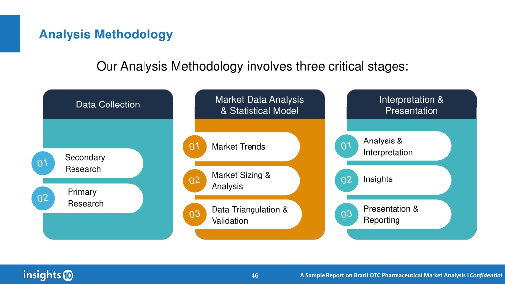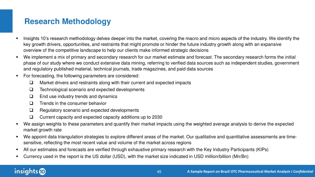 Research Methodology Insights 10’s research methodology delves deeper into the market, covering the macro and micro aspects of the industry. We identify the key growth drivers, opportunities, and restraints that might promote or hinder the future industry growth along with an expansive overview of the competitive landscape to help our clients make informed strategic decisions We implement a mix of primary and secondary research for our market estimate and forecast. The secondary research forms the initial phase of our study where we conduct extensive data mining, referring to verified data sources such as independent studies, government and regulatory published material, technical journals, trade magazines, and paid data sources For forecasting, the following parameters are considered: ❑ Market drivers and restraints along with their current and expected impacts ❑ Technological scenario and expected developments ❑ End use industry trends and dynamics ❑ Trends in the consumer behavior ❑ Regulatory scenario and expected developments ❑ Current capacity and expected capacity additions up to 2030 We assign weights to these parameters and quantify their market impacts using the weighted average analysis to derive the expected market growth rate We appoint data triangulation strategies to explore different areas of the market. Our qualitative and quantitative assessments are time- sensitive, reflecting the most recent value and volume of the market across regions All our estimates and forecasts are verified through exhaustive primary research with the Key Industry Participants (KIPs) Currency used in the report is the US dollar (USD), with the market size indicated in USD million/billion (Mn/Bn) ▪ ▪ ▪ ▪ ▪ ▪ ▪ 45 A Sample Report on Brazil OTC Pharmaceutical Market Analysis I Confidential