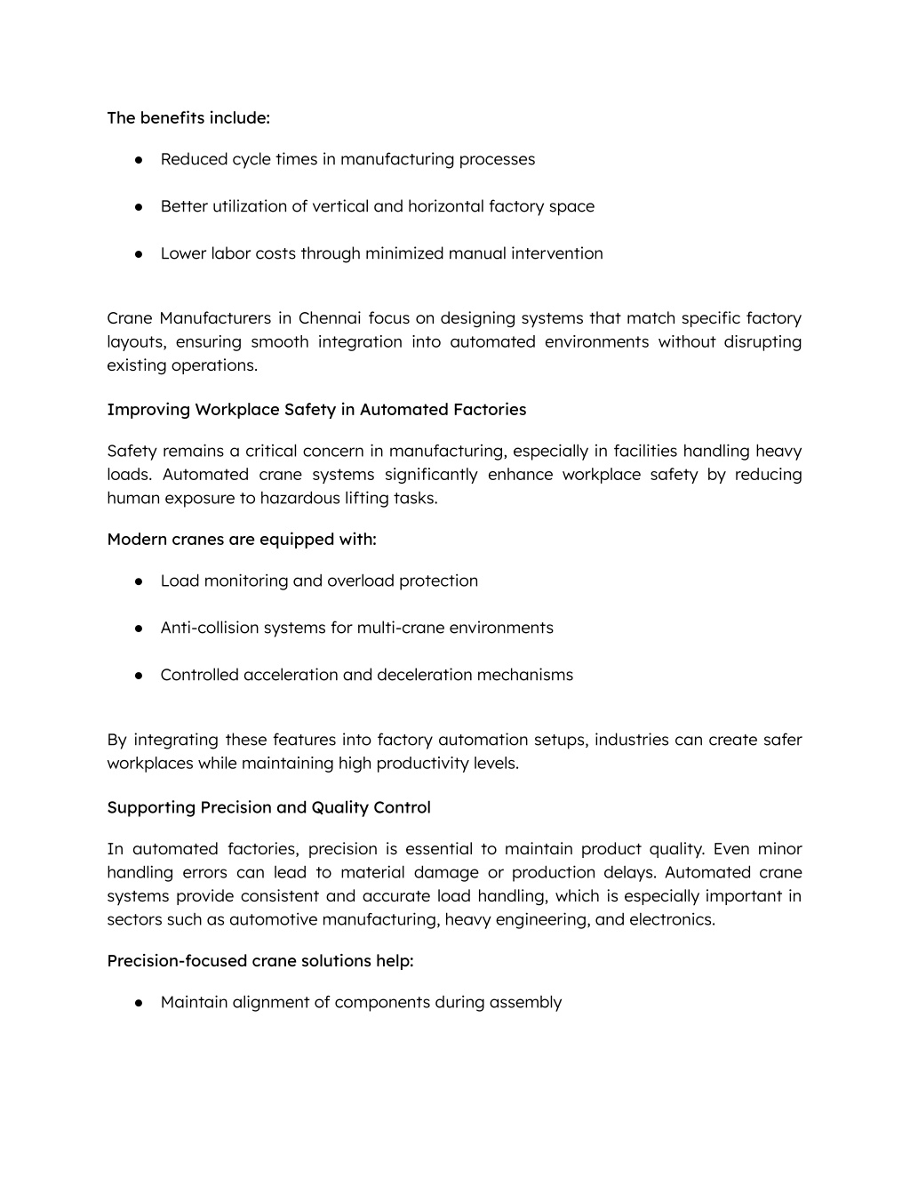 The benefits include: ● Reduced cycle times in manufacturing processes ● Better utilization of vertical and horizontal factory space ● Lower labor costs through minimized manual intervention Crane Manufacturers in Chennai focus on designing systems that match specific factory layouts, ensuring smooth integration into automated environments without disrupting existing operations. Improving Workplace Safety in Automated Factories Safety remains a critical concern in manufacturing, especially in facilities handling heavy loads. Automated crane systems significantly enhance workplace safety by reducing human exposure to hazardous lifting tasks. Modern cranes are equipped with: ● Load monitoring and overload protection ● Anti-collision systems for multi-crane environments ● Controlled acceleration and deceleration mechanisms By integrating these features into factory automation setups, industries can create safer workplaces while maintaining high productivity levels. Supporting Precision and Quality Control In automated factories, precision is essential to maintain product quality. Even minor handling errors can lead to material damage or production delays. Automated crane systems provide consistent and accurate load handling, which is especially important in sectors such as automotive manufacturing, heavy engineering, and electronics. Precision-focused crane solutions help: ● Maintain alignment of components during assembly