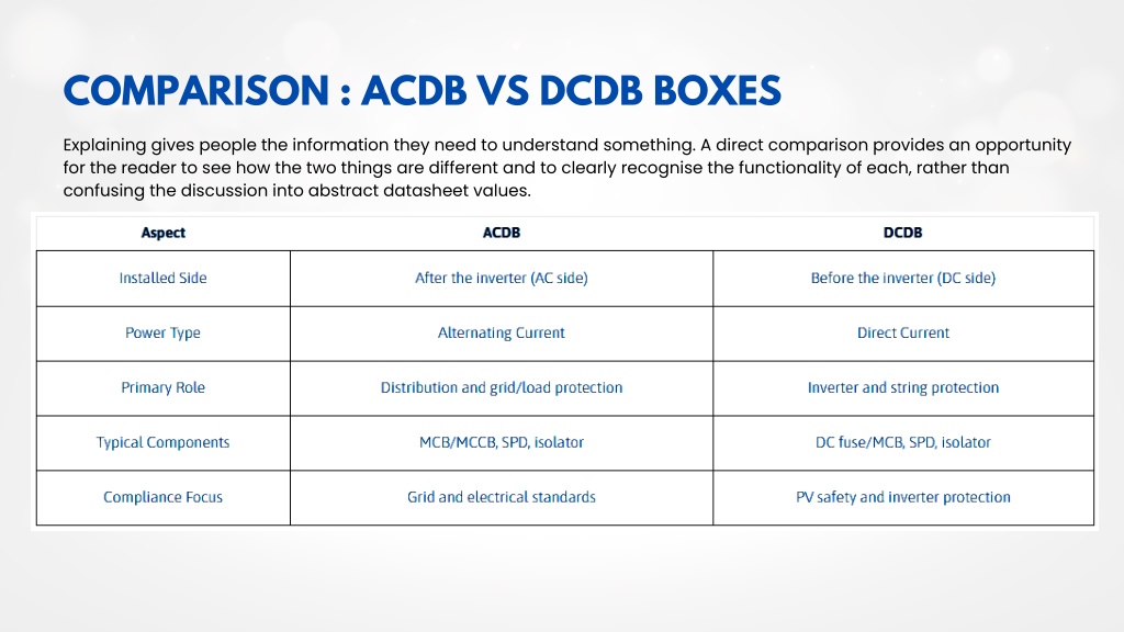 COMPARISON : ACDB VS DCDB BOXES Explaining gives people the information they need to understand something. A direct comparison provides an opportunity for the reader to see how the two things are different and to clearly recognise the functionality of each, rather than confusing the discussion into abstract datasheet values.