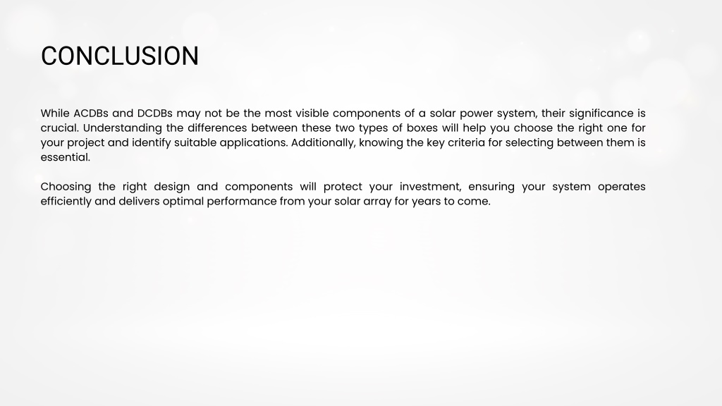 CONCLUSION While ACDBs and DCDBs may not be the most visible components of a solar power system, their significance is crucial. Understanding the differences between these two types of boxes will help you choose the right one for your project and identify suitable applications. Additionally, knowing the key criteria for selecting between them is essential. Choosing the right design and components will protect your investment, ensuring your system operates efficiently and delivers optimal performance from your solar array for years to come.