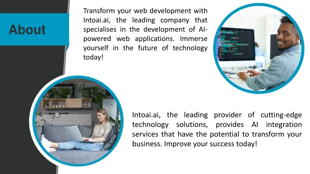 Transform your web development with Intoai.ai, the leading company that specialises in the development of AI-powered web applications. Immerse yourself in the future of technology today! About Intoai.ai, the leading provider of cutting-edge technology solutions, provides AI integration services that have the potential to transform your business. Improve your success today!