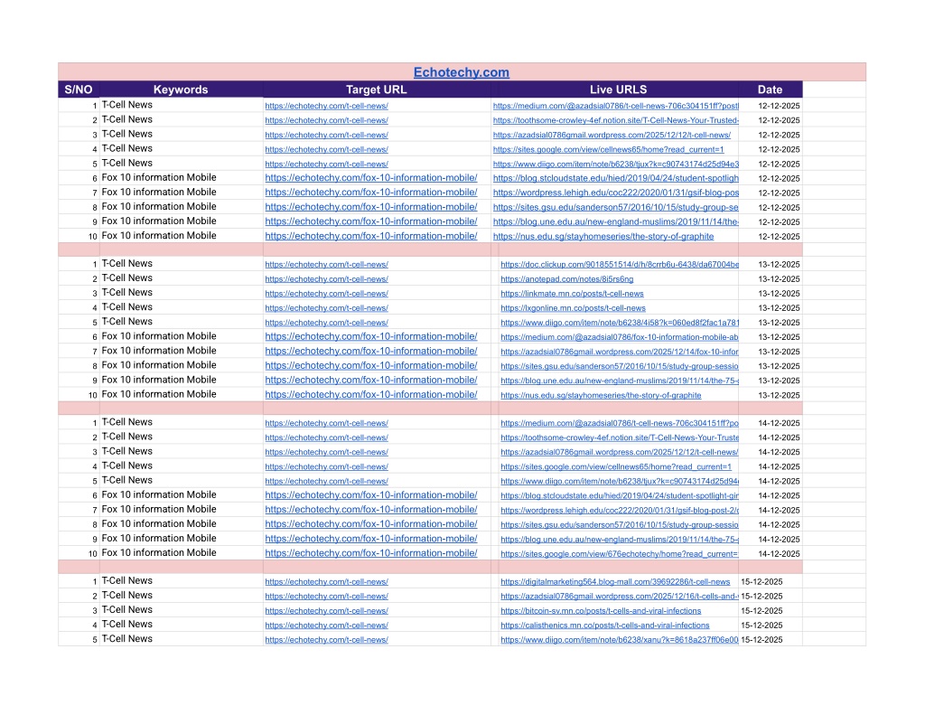 1. Echotechy.com S/NO Keywords Target URL Live URLS Date 1 T-Cell News 2 T-Cell News 3 T-Cell News 4 T-Cell News 5 T-Cell News 6 Fox 10 information Mobile 7 Fox 10 information Mobile 8 Fox 10 information Mobile 9 Fox 10 information Mobile 10 Fox 10 information Mobile https://echotechy.com/t-cell-news/ https://medium.com/@azadsial0786/t-cell-news-706c304151ff?postPublishedType=initial 12-12-2025 https://echotechy.com/t-cell-news/ https://toothsome-crowley-4ef.notion.site/T-Cell-News-Your-Trusted-Source-for-Immune-System-Insights-2c7a433cc2fd8090822bedfbfe1b2ef8 12-12-2025 https://echotechy.com/t-cell-news/ https://azadsial0786gmail.wordpress.com/2025/12/12/t-cell-news/ 12-12-2025 https://echotechy.com/t-cell-news/ https://sites.google.com/view/cellnews65/home?read_current=1 12-12-2025 https://echotechy.com/t-cell-news/ https://echotechy.com/fox-10-information-mobile/ https://echotechy.com/fox-10-information-mobile/ https://echotechy.com/fox-10-information-mobile/ https://echotechy.com/fox-10-information-mobile/ https://echotechy.com/fox-10-information-mobile/ https://www.diigo.com/item/note/b6238/tjux?k=c90743174d25d94e32976d2f45890e66 https://blog.stcloudstate.edu/hied/2019/04/24/student-spotlight-ginny-walters/comment-page-28/#comment-387322 https://wordpress.lehigh.edu/coc222/2020/01/31/gsif-blog-post-2/comment-page-42/#comment-147111 https://sites.gsu.edu/sanderson57/2016/10/15/study-group-session/comment-page-209/#comment-59859 https://blog.une.edu.au/new-england-muslims/2019/11/14/the-75-good-manners-commandments-in-the-quran/comment-page-14/#comment-4444 12-12-2025 https://nus.edu.sg/stayhomeseries/the-story-of-graphite 12-12-2025 12-12-2025 12-12-2025 12-12-2025 12-12-2025 1 T-Cell News 2 T-Cell News 3 T-Cell News 4 T-Cell News 5 T-Cell News 6 Fox 10 information Mobile 7 Fox 10 information Mobile 8 Fox 10 information Mobile 9 Fox 10 information Mobile 10 Fox 10 information Mobile https://echotechy.com/t-cell-news/ https://doc.clickup.com/9018551514/d/h/8crrb6u-6438/da67004beb132aa 13-12-2025 https://echotechy.com/t-cell-news/ https://anotepad.com/notes/8i5rs6ng 13-12-2025 https://echotechy.com/t-cell-news/ https://linkmate.mn.co/posts/t-cell-news 13-12-2025 https://echotechy.com/t-cell-news/ https://lxgonline.mn.co/posts/t-cell-news 13-12-2025 https://echotechy.com/t-cell-news/ https://echotechy.com/fox-10-information-mobile/ https://echotechy.com/fox-10-information-mobile/ https://echotechy.com/fox-10-information-mobile/ https://echotechy.com/fox-10-information-mobile/ https://echotechy.com/fox-10-information-mobile/ https://www.diigo.com/item/note/b6238/4i58?k=060ed8f2fac1a781cb29a973755c30ea 13-12-2025 https://medium.com/@azadsial0786/fox-10-information-mobile-ab68ef5e62fc?postPublishedType=initial 13-12-2025 https://azadsial0786gmail.wordpress.com/2025/12/14/fox-10-information-mobile/ 13-12-2025 https://sites.gsu.edu/sanderson57/2016/10/15/study-group-session/comment-page-209/#comment-59859 13-12-2025 https://blog.une.edu.au/new-england-muslims/2019/11/14/the-75-good-manners-commandments-in-the-quran/comment-page-14/#comment-4444 13-12-2025 https://nus.edu.sg/stayhomeseries/the-story-of-graphite 13-12-2025 1 T-Cell News 2 T-Cell News 3 T-Cell News 4 T-Cell News 5 T-Cell News 6 Fox 10 information Mobile 7 Fox 10 information Mobile 8 Fox 10 information Mobile 9 Fox 10 information Mobile 10 Fox 10 information Mobile https://echotechy.com/t-cell-news/ https://medium.com/@azadsial0786/t-cell-news-706c304151ff?postPublishedType=initial 14-12-2025 https://echotechy.com/t-cell-news/ https://toothsome-crowley-4ef.notion.site/T-Cell-News-Your-Trusted-Source-for-Immune-System-Insights-2c7a433cc2fd8090822bedfbfe1b2ef8 14-12-2025 https://echotechy.com/t-cell-news/ https://azadsial0786gmail.wordpress.com/2025/12/12/t-cell-news/ 14-12-2025 https://echotechy.com/t-cell-news/ https://sites.google.com/view/cellnews65/home?read_current=1 14-12-2025 https://echotechy.com/t-cell-news/ https://echotechy.com/fox-10-information-mobile/ https://echotechy.com/fox-10-information-mobile/ https://echotechy.com/fox-10-information-mobile/ https://echotechy.com/fox-10-information-mobile/ https://echotechy.com/fox-10-information-mobile/ https://www.diigo.com/item/note/b6238/tjux?k=c90743174d25d94e32976d2f45890e66 14-12-2025 https://blog.stcloudstate.edu/hied/2019/04/24/student-spotlight-ginny-walters/comment-page-28/#comment-387322 14-12-2025 https://wordpress.lehigh.edu/coc222/2020/01/31/gsif-blog-post-2/comment-page-42/#comment-147111 14-12-2025 https://sites.gsu.edu/sanderson57/2016/10/15/study-group-session/comment-page-209/#comment-59859 14-12-2025 https://blog.une.edu.au/new-england-muslims/2019/11/14/the-75-good-manners-commandments-in-the-quran/comment-page-14/#comment-4444 14-12-2025 https://sites.google.com/view/676echotechy/home?read_current=1 14-12-2025 1 T-Cell News 2 T-Cell News 3 T-Cell News 4 T-Cell News 5 T-Cell News https://echotechy.com/t-cell-news/ https://digitalmarketing564.blog-mall.com/39692286/t-cell-news 15-12-2025 https://echotechy.com/t-cell-news/ https://azadsial0786gmail.wordpress.com/2025/12/16/t-cells-and-viral-infections/ 15-12-2025 https://echotechy.com/t-cell-news/ https://bitcoin-sv.mn.co/posts/t-cells-and-viral-infections 15-12-2025 https://echotechy.com/t-cell-news/ https://calisthenics.mn.co/posts/t-cells-and-viral-infections 15-12-2025 https://echotechy.com/t-cell-news/ https://www.diigo.com/item/note/b6238/xanu?k=8618a237ff06e00ebf09d6e0c68c91c1 15-12-2025