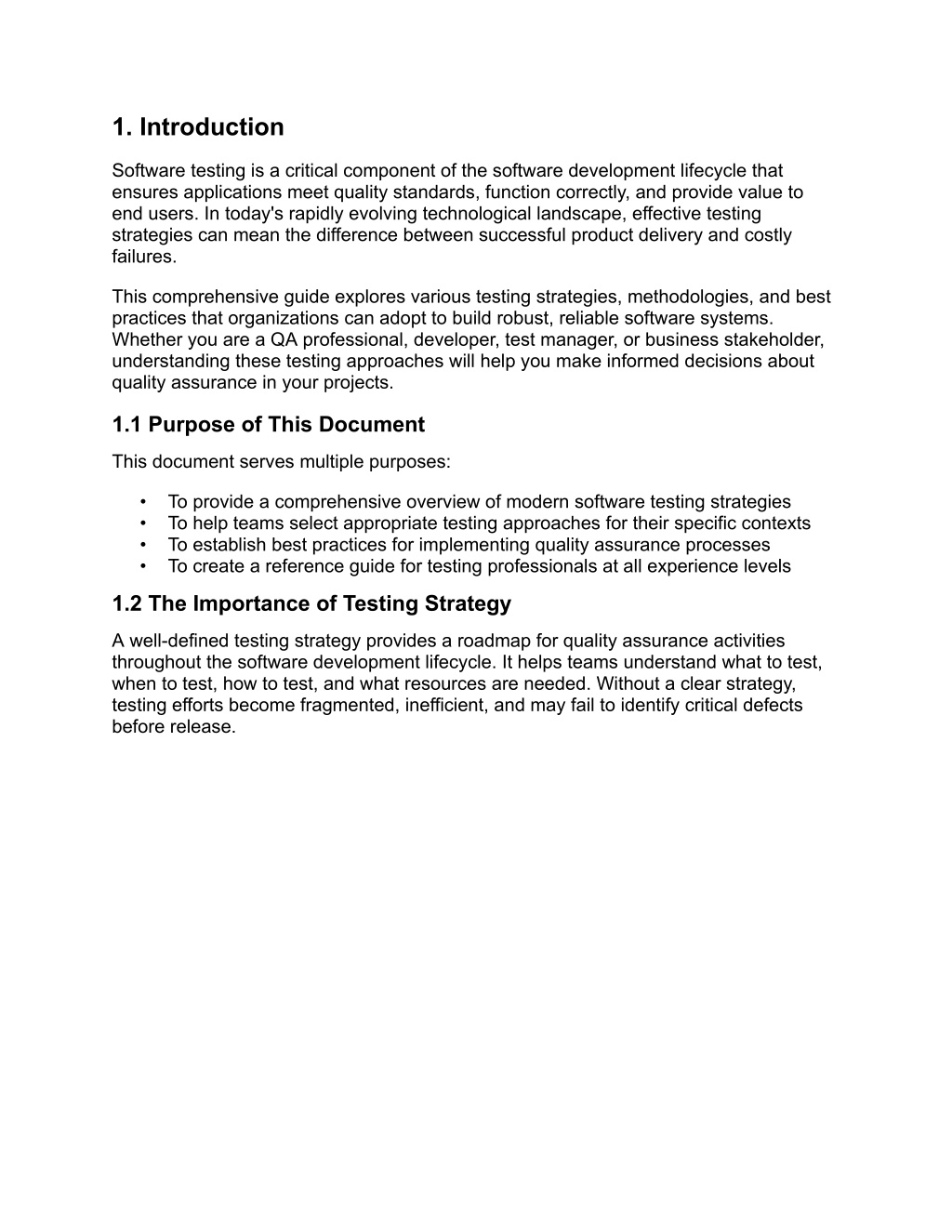 1. Introduction Software testing is a critical component of the software development lifecycle that ensures applications meet quality standards, function correctly, and provide value to end users. In today's rapidly evolving technological landscape, effective testing strategies can mean the difference between successful product delivery and costly failures. This comprehensive guide explores various testing strategies, methodologies, and best practices that organizations can adopt to build robust, reliable software systems. Whether you are a QA professional, developer, test manager, or business stakeholder, understanding these testing approaches will help you make informed decisions about quality assurance in your projects. 1.1 Purpose of This Document This document serves multiple purposes: • To provide a comprehensive overview of modern software testing strategies • To help teams select appropriate testing approaches for their specific contexts • To establish best practices for implementing quality assurance processes • To create a reference guide for testing professionals at all experience levels 1.2 The Importance of Testing Strategy A well-defined testing strategy provides a roadmap for quality assurance activities throughout the software development lifecycle. It helps teams understand what to test, when to test, how to test, and what resources are needed. Without a clear strategy, testing efforts become fragmented, inefficient, and may fail to identify critical defects before release.