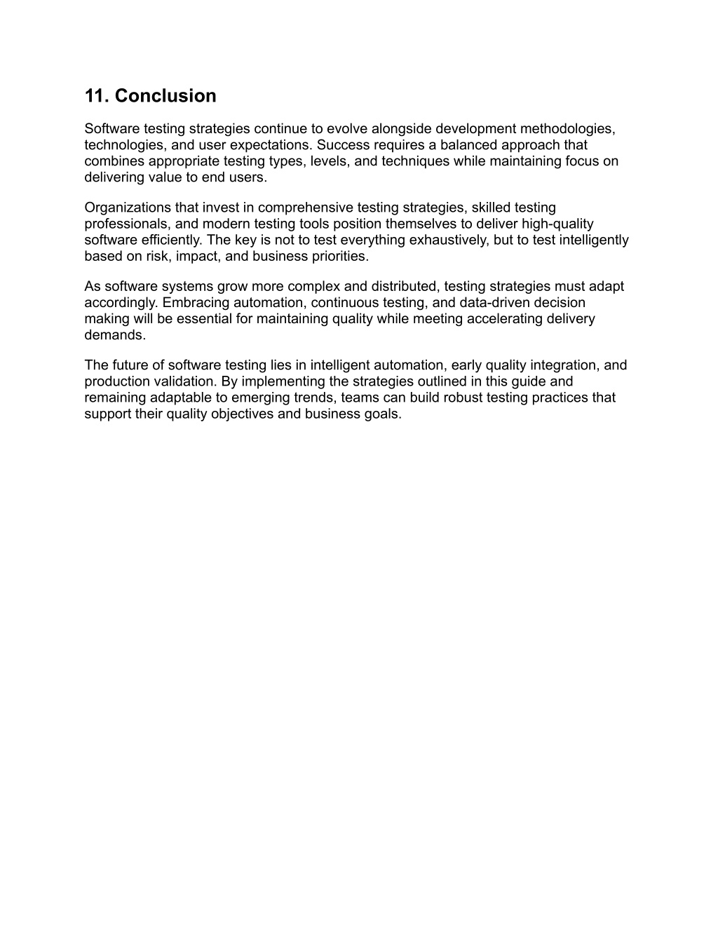 11. Conclusion Software testing strategies continue to evolve alongside development methodologies, technologies, and user expectations. Success requires a balanced approach that combines appropriate testing types, levels, and techniques while maintaining focus on delivering value to end users. Organizations that invest in comprehensive testing strategies, skilled testing professionals, and modern testing tools position themselves to deliver high-quality software efficiently. The key is not to test everything exhaustively, but to test intelligently based on risk, impact, and business priorities. As software systems grow more complex and distributed, testing strategies must adapt accordingly. Embracing automation, continuous testing, and data-driven decision making will be essential for maintaining quality while meeting accelerating delivery demands. The future of software testing lies in intelligent automation, early quality integration, and production validation. By implementing the strategies outlined in this guide and remaining adaptable to emerging trends, teams can build robust testing practices that support their quality objectives and business goals.