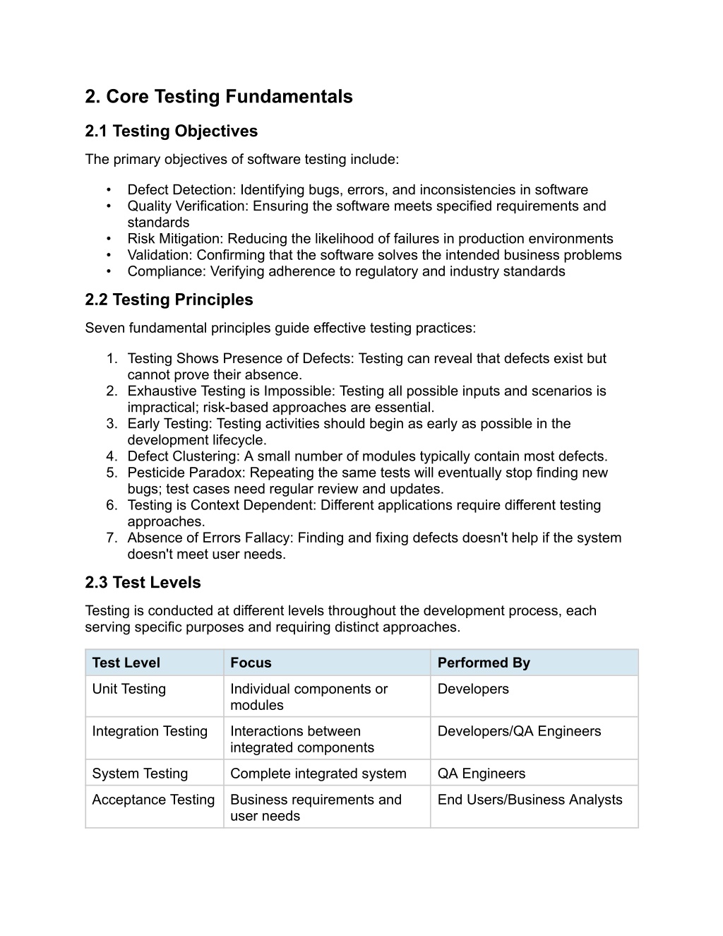 2. Core Testing Fundamentals 2.1 Testing Objectives The primary objectives of software testing include: • Defect Detection: Identifying bugs, errors, and inconsistencies in software • Quality Verification: Ensuring the software meets specified requirements and standards • Risk Mitigation: Reducing the likelihood of failures in production environments • Validation: Confirming that the software solves the intended business problems • Compliance: Verifying adherence to regulatory and industry standards 2.2 Testing Principles Seven fundamental principles guide effective testing practices: 1. Testing Shows Presence of Defects: Testing can reveal that defects exist but cannot prove their absence. 2. Exhaustive Testing is Impossible: Testing all possible inputs and scenarios is impractical; risk-based approaches are essential. 3. Early Testing: Testing activities should begin as early as possible in the development lifecycle. 4. Defect Clustering: A small number of modules typically contain most defects. 5. Pesticide Paradox: Repeating the same tests will eventually stop finding new bugs; test cases need regular review and updates. 6. Testing is Context Dependent: Different applications require different testing approaches. 7. Absence of Errors Fallacy: Finding and fixing defects doesn't help if the system doesn't meet user needs. 2.3 Test Levels Testing is conducted at different levels throughout the development process, each serving specific purposes and requiring distinct approaches. Test Level Focus Performed By Unit Testing Individual components or modules Developers Integration Testing Interactions between integrated components Developers/QA Engineers System Testing Complete integrated system QA Engineers Acceptance Testing Business requirements and user needs End Users/Business Analysts