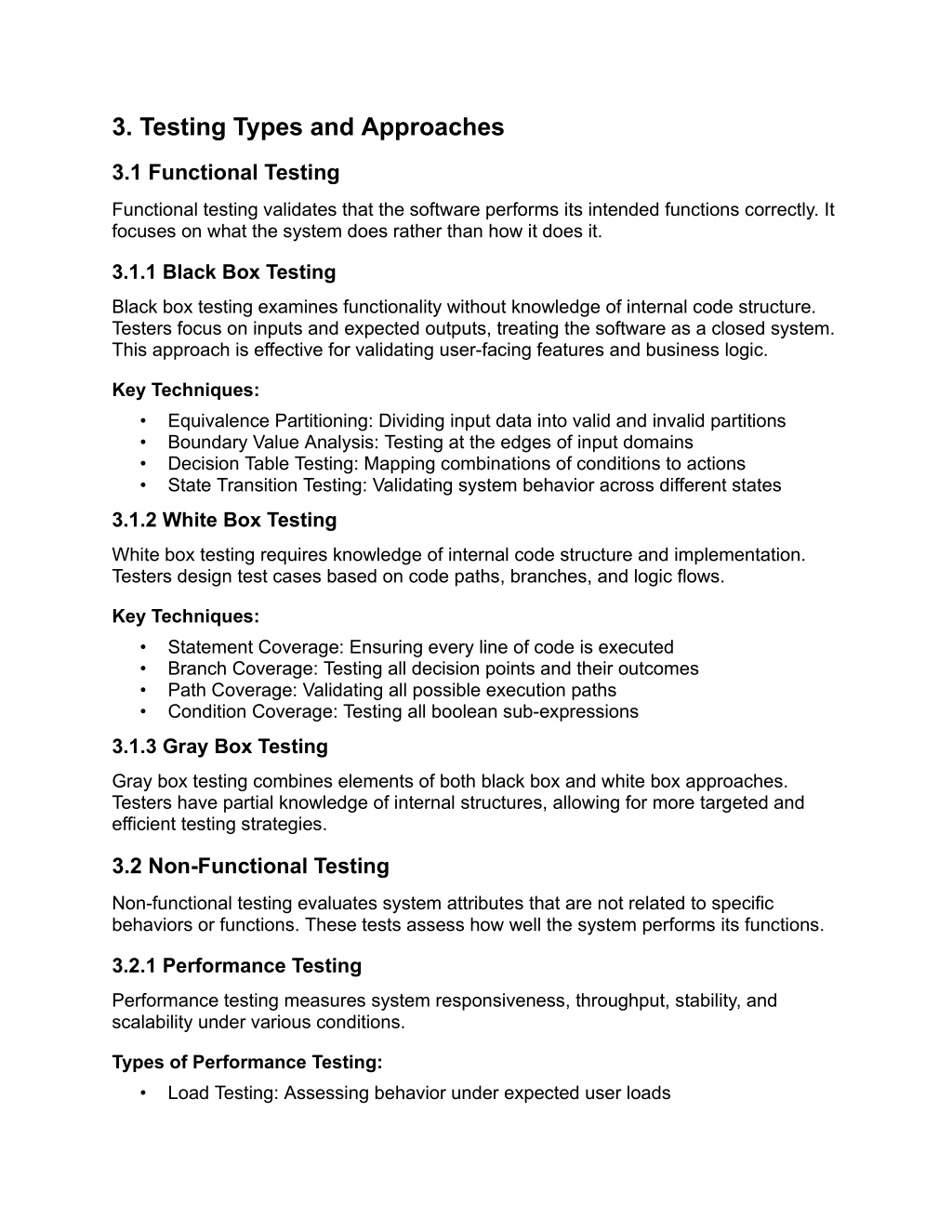 3. Testing Types and Approaches 3.1 Functional Testing Functional testing validates that the software performs its intended functions correctly. It focuses on what the system does rather than how it does it. 3.1.1 Black Box Testing Black box testing examines functionality without knowledge of internal code structure. Testers focus on inputs and expected outputs, treating the software as a closed system. This approach is effective for validating user-facing features and business logic. Key Techniques: • Equivalence Partitioning: Dividing input data into valid and invalid partitions • Boundary Value Analysis: Testing at the edges of input domains • Decision Table Testing: Mapping combinations of conditions to actions • State Transition Testing: Validating system behavior across different states 3.1.2 White Box Testing White box testing requires knowledge of internal code structure and implementation. Testers design test cases based on code paths, branches, and logic flows. Key Techniques: • Statement Coverage: Ensuring every line of code is executed • Branch Coverage: Testing all decision points and their outcomes • Path Coverage: Validating all possible execution paths • Condition Coverage: Testing all boolean sub-expressions 3.1.3 Gray Box Testing Gray box testing combines elements of both black box and white box approaches. Testers have partial knowledge of internal structures, allowing for more targeted and efficient testing strategies. 3.2 Non-Functional Testing Non-functional testing evaluates system attributes that are not related to specific behaviors or functions. These tests assess how well the system performs its functions. 3.2.1 Performance Testing Performance testing measures system responsiveness, throughput, stability, and scalability under various conditions. Types of Performance Testing: • Load Testing: Assessing behavior under expected user loads