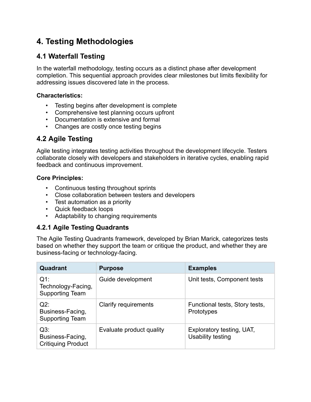 4. Testing Methodologies 4.1 Waterfall Testing In the waterfall methodology, testing occurs as a distinct phase after development completion. This sequential approach provides clear milestones but limits flexibility for addressing issues discovered late in the process. Characteristics: • Testing begins after development is complete • Comprehensive test planning occurs upfront • Documentation is extensive and formal • Changes are costly once testing begins 4.2 Agile Testing Agile testing integrates testing activities throughout the development lifecycle. Testers collaborate closely with developers and stakeholders in iterative cycles, enabling rapid feedback and continuous improvement. Core Principles: • Continuous testing throughout sprints • Close collaboration between testers and developers • Test automation as a priority • Quick feedback loops • Adaptability to changing requirements 4.2.1 Agile Testing Quadrants The Agile Testing Quadrants framework, developed by Brian Marick, categorizes tests based on whether they support the team or critique the product, and whether they are business-facing or technology-facing. Quadrant Purpose Examples Q1: Technology-Facing, Supporting Team Guide development Unit tests, Component tests Q2: Business-Facing, Supporting Team Clarify requirements Functional tests, Story tests, Prototypes Q3: Business-Facing, Critiquing Product Evaluate product quality Exploratory testing, UAT, Usability testing