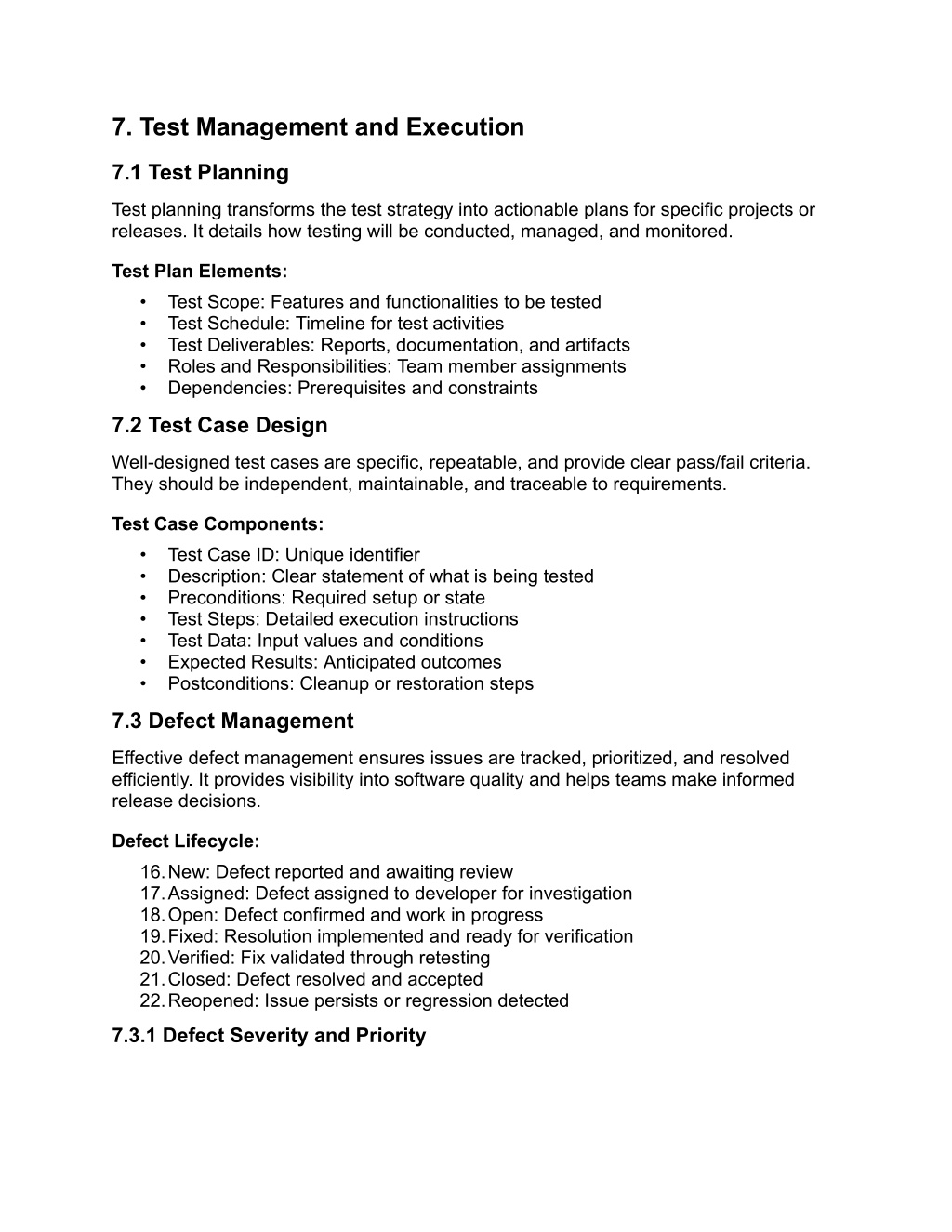 7. Test Management and Execution 7.1 Test Planning Test planning transforms the test strategy into actionable plans for specific projects or releases. It details how testing will be conducted, managed, and monitored. Test Plan Elements: • Test Scope: Features and functionalities to be tested • Test Schedule: Timeline for test activities • Test Deliverables: Reports, documentation, and artifacts • Roles and Responsibilities: Team member assignments • Dependencies: Prerequisites and constraints 7.2 Test Case Design Well-designed test cases are specific, repeatable, and provide clear pass/fail criteria. They should be independent, maintainable, and traceable to requirements. Test Case Components: • Test Case ID: Unique identifier • Description: Clear statement of what is being tested • Preconditions: Required setup or state • Test Steps: Detailed execution instructions • Test Data: Input values and conditions • Expected Results: Anticipated outcomes • Postconditions: Cleanup or restoration steps 7.3 Defect Management Effective defect management ensures issues are tracked, prioritized, and resolved efficiently. It provides visibility into software quality and helps teams make informed release decisions. Defect Lifecycle: 16. New: Defect reported and awaiting review 17. Assigned: Defect assigned to developer for investigation 18. Open: Defect confirmed and work in progress 19. Fixed: Resolution implemented and ready for verification 20. Verified: Fix validated through retesting 21. Closed: Defect resolved and accepted 22. Reopened: Issue persists or regression detected 7.3.1 Defect Severity and Priority