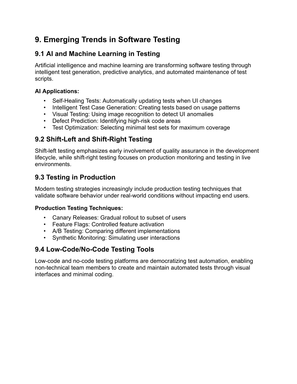 9. Emerging Trends in Software Testing 9.1 AI and Machine Learning in Testing Artificial intelligence and machine learning are transforming software testing through intelligent test generation, predictive analytics, and automated maintenance of test scripts. AI Applications: • Self-Healing Tests: Automatically updating tests when UI changes • Intelligent Test Case Generation: Creating tests based on usage patterns • Visual Testing: Using image recognition to detect UI anomalies • Defect Prediction: Identifying high-risk code areas • Test Optimization: Selecting minimal test sets for maximum coverage 9.2 Shift-Left and Shift-Right Testing Shift-left testing emphasizes early involvement of quality assurance in the development lifecycle, while shift-right testing focuses on production monitoring and testing in live environments. 9.3 Testing in Production Modern testing strategies increasingly include production testing techniques that validate software behavior under real-world conditions without impacting end users. Production Testing Techniques: • Canary Releases: Gradual rollout to subset of users • Feature Flags: Controlled feature activation • A/B Testing: Comparing different implementations • Synthetic Monitoring: Simulating user interactions 9.4 Low-Code/No-Code Testing Tools Low-code and no-code testing platforms are democratizing test automation, enabling non-technical team members to create and maintain automated tests through visual interfaces and minimal coding.