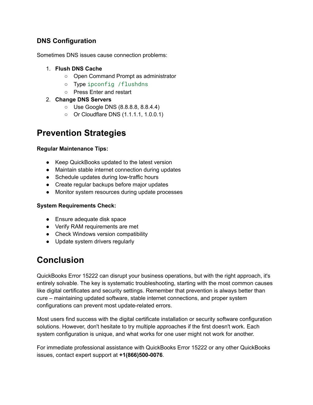 DNS Configuration Sometimes DNS issues cause connection problems: 1. Flush DNS Cache ○ Open Command Prompt as administrator ○ Type ipconfig /flushdns ○ Press Enter and restart 2. Change DNS Servers ○ Use Google DNS (8.8.8.8, 8.8.4.4) ○ Or Cloudflare DNS (1.1.1.1, 1.0.0.1) Prevention Strategies Regular Maintenance Tips: ● Keep QuickBooks updated to the latest version ● Maintain stable internet connection during updates ● Schedule updates during low-traffic hours ● Create regular backups before major updates ● Monitor system resources during update processes System Requirements Check: ● Ensure adequate disk space ● Verify RAM requirements are met ● Check Windows version compatibility ● Update system drivers regularly Conclusion QuickBooks Error 15222 can disrupt your business operations, but with the right approach, it's entirely solvable. The key is systematic troubleshooting, starting with the most common causes like digital certificates and security settings. Remember that prevention is always better than cure – maintaining updated software, stable internet connections, and proper system configurations can prevent most update-related errors. Most users find success with the digital certificate installation or security software configuration solutions. However, don't hesitate to try multiple approaches if the first doesn't work. Each system configuration is unique, and what works for one user might not work for another. For immediate professional assistance with QuickBooks Error 15222 or any other QuickBooks issues, contact expert support at +1(866)500-0076.