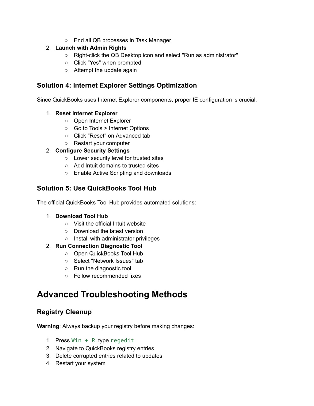 ○ End all QB processes in Task Manager 2. Launch with Admin Rights ○ Right-click the QB Desktop icon and select "Run as administrator" ○ Click "Yes" when prompted ○ Attempt the update again Solution 4: Internet Explorer Settings Optimization Since QuickBooks uses Internet Explorer components, proper IE configuration is crucial: 1. Reset Internet Explorer ○ Open Internet Explorer ○ Go to Tools > Internet Options ○ Click "Reset" on Advanced tab ○ Restart your computer 2. Configure Security Settings ○ Lower security level for trusted sites ○ Add Intuit domains to trusted sites ○ Enable Active Scripting and downloads Solution 5: Use QuickBooks Tool Hub The official QuickBooks Tool Hub provides automated solutions: 1. Download Tool Hub ○ Visit the official Intuit website ○ Download the latest version ○ Install with administrator privileges 2. Run Connection Diagnostic Tool ○ Open QuickBooks Tool Hub ○ Select "Network Issues" tab ○ Run the diagnostic tool ○ Follow recommended fixes Advanced Troubleshooting Methods Registry Cleanup Warning: Always backup your registry before making changes: 1. Press Win + R, type regedit 2. Navigate to QuickBooks registry entries 3. Delete corrupted entries related to updates 4. Restart your system