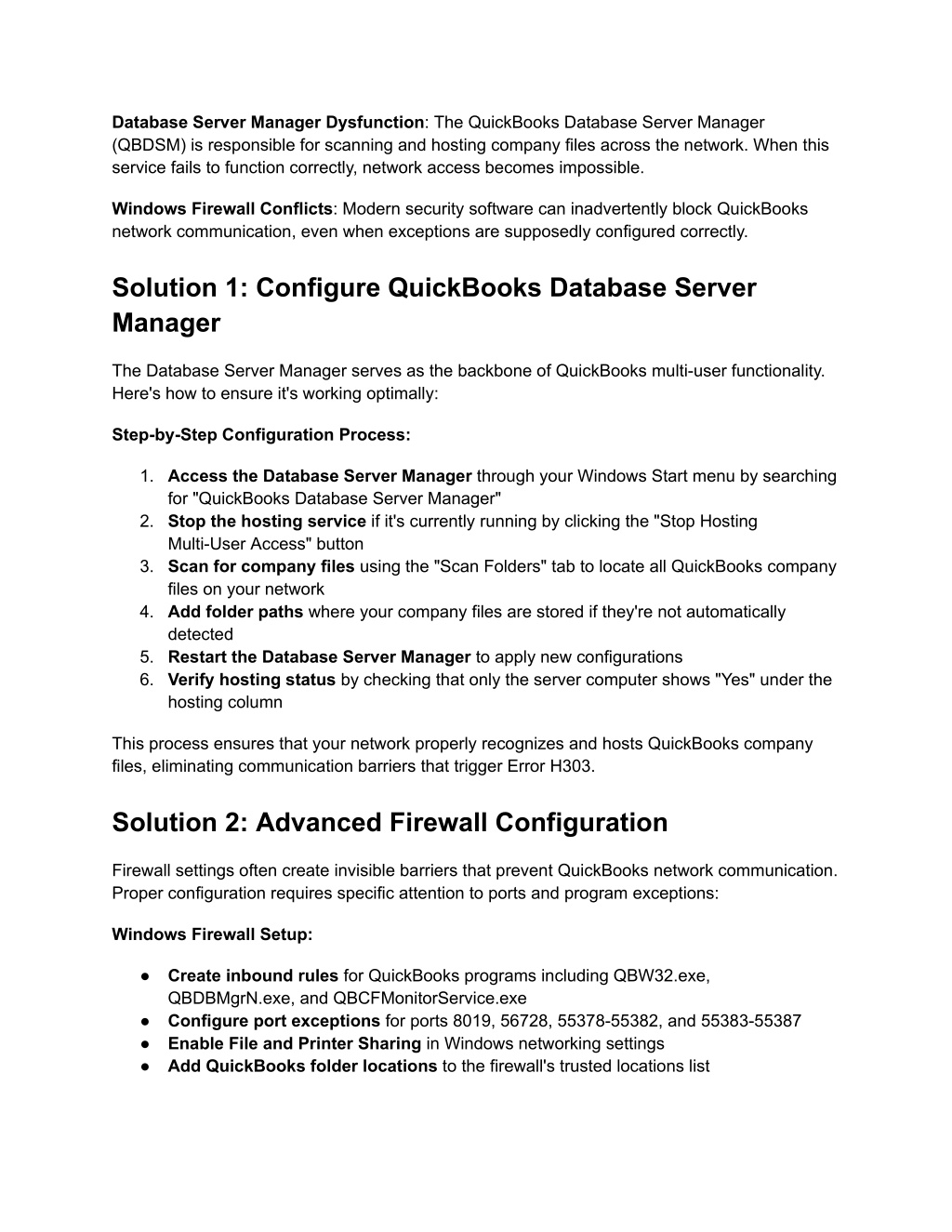 Database Server Manager Dysfunction: The QuickBooks Database Server Manager (QBDSM) is responsible for scanning and hosting company files across the network. When this service fails to function correctly, network access becomes impossible. Windows Firewall Conflicts: Modern security software can inadvertently block QuickBooks network communication, even when exceptions are supposedly configured correctly. Solution 1: Configure QuickBooks Database Server Manager The Database Server Manager serves as the backbone of QuickBooks multi-user functionality. Here's how to ensure it's working optimally: Step-by-Step Configuration Process: 1. Access the Database Server Manager through your Windows Start menu by searching for "QuickBooks Database Server Manager" 2. Stop the hosting service if it's currently running by clicking the "Stop Hosting Multi-User Access" button 3. Scan for company files using the "Scan Folders" tab to locate all QuickBooks company files on your network 4. Add folder paths where your company files are stored if they're not automatically detected 5. Restart the Database Server Manager to apply new configurations 6. Verify hosting status by checking that only the server computer shows "Yes" under the hosting column This process ensures that your network properly recognizes and hosts QuickBooks company files, eliminating communication barriers that trigger Error H303. Solution 2: Advanced Firewall Configuration Firewall settings often create invisible barriers that prevent QuickBooks network communication. Proper configuration requires specific attention to ports and program exceptions: Windows Firewall Setup: ● Create inbound rules for QuickBooks programs including QBW32.exe, QBDBMgrN.exe, and QBCFMonitorService.exe ● Configure port exceptions for ports 8019, 56728, 55378-55382, and 55383-55387 ● Enable File and Printer Sharing in Windows networking settings ● Add QuickBooks folder locations to the firewall's trusted locations list
