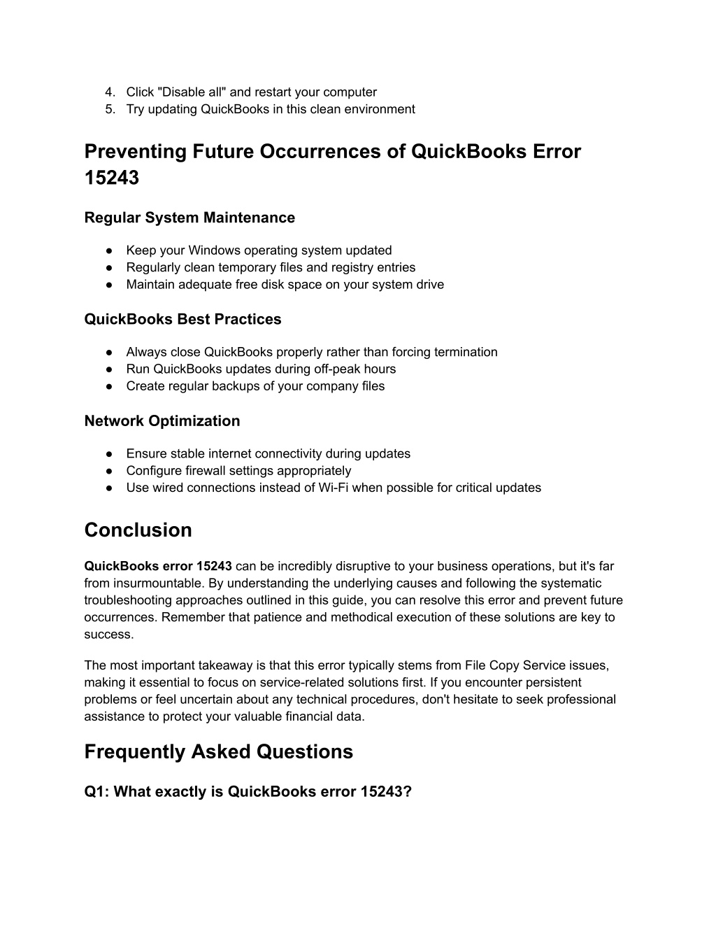 4. Click "Disable all" and restart your computer 5. Try updating QuickBooks in this clean environment Preventing Future Occurrences of QuickBooks Error 15243 Regular System Maintenance ● Keep your Windows operating system updated ● Regularly clean temporary files and registry entries ● Maintain adequate free disk space on your system drive QuickBooks Best Practices ● Always close QuickBooks properly rather than forcing termination ● Run QuickBooks updates during off-peak hours ● Create regular backups of your company files Network Optimization ● Ensure stable internet connectivity during updates ● Configure firewall settings appropriately ● Use wired connections instead of Wi-Fi when possible for critical updates Conclusion QuickBooks error 15243 can be incredibly disruptive to your business operations, but it's far from insurmountable. By understanding the underlying causes and following the systematic troubleshooting approaches outlined in this guide, you can resolve this error and prevent future occurrences. Remember that patience and methodical execution of these solutions are key to success. The most important takeaway is that this error typically stems from File Copy Service issues, making it essential to focus on service-related solutions first. If you encounter persistent problems or feel uncertain about any technical procedures, don't hesitate to seek professional assistance to protect your valuable financial data. Frequently Asked Questions Q1: What exactly is QuickBooks error 15243?