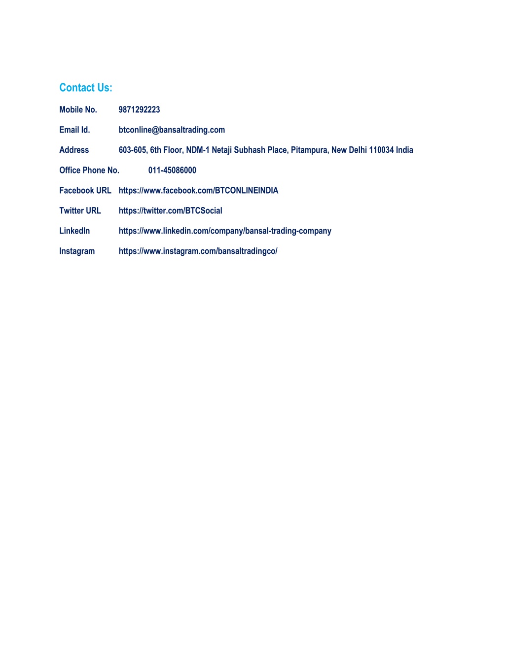 Contact Us: Mobile No. 9871292223 Email Id. btconline@bansaltrading.com Address 603-605, 6th Floor, NDM-1 Netaji Subhash Place, Pitampura, New Delhi 110034 India Office Phone No. 011-45086000 Facebook URL https://www.facebook.com/BTCONLINEINDIA Twitter URL https://twitter.com/BTCSocial LinkedIn https://www.linkedin.com/company/bansal-trading-company Instagram https://www.instagram.com/bansaltradingco/