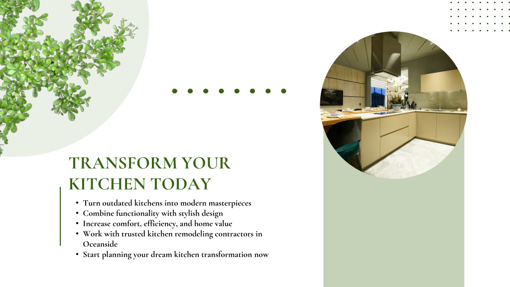 TRANSFORM YOUR KITCHEN TODAY • Turn outdated kitchens into modern masterpieces • Combine functionality with stylish design • Increase comfort, efficiency, and home value • Work with trusted kitchen remodeling contractors in Oceanside • Start planning your dream kitchen transformation now