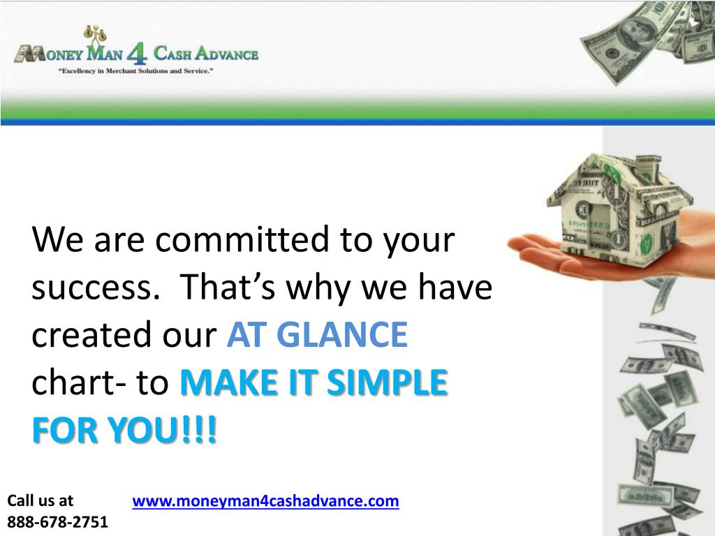 We are committed to your success. That’s why we have created our AT GLANCE chart- to MAKE IT SIMPLE FOR YOU!!! Call us at 888-678-2751 www.moneyman4cashadvance.com