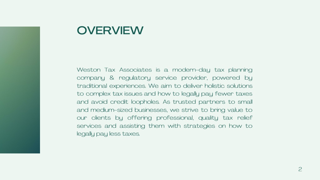OVERVIEW Weston Tax Associates is a modern-day tax planning company & regulatory service provider, powered by traditional experiences. We aim to deliver holistic solutions to complex tax issues and how to legally pay fewer taxes and avoid credit loopholes. As trusted partners to small and medium-sized businesses, we strive to bring value to our clients by offering professional, quality tax relief services and assisting them with strategies on how to legally pay less taxes. 2