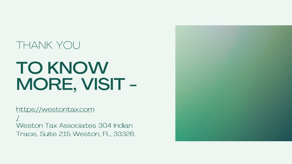 THANK YOU TO KNOW MORE, VISIT - https://westontax.com/ Weston Tax Associates 304 Indian Trace, Suite 215 Weston, FL, 33326