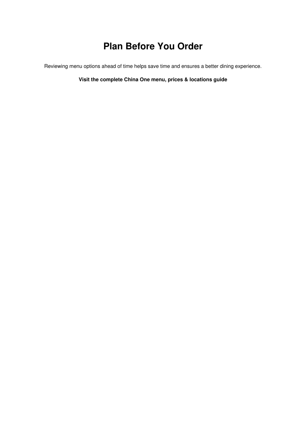 Plan Before You Order Reviewing menu options ahead of time helps save time and ensures a better dining experience. Visit the complete China One menu, prices & locations guide