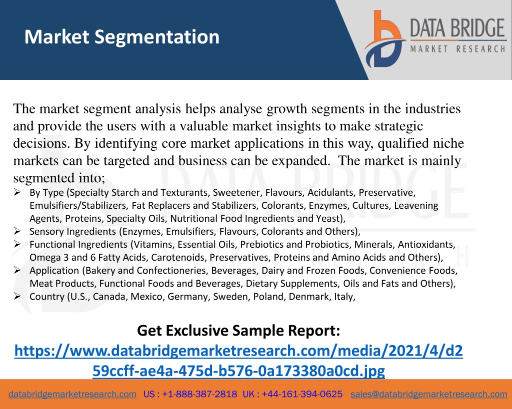 Market Segmentation • The market segment analysis helps analyse growth segments in the industries and provide the users with a valuable market insights to make strategic decisions. By identifying core market applications in this way, qualified niche markets can be targeted and business can be expanded. The market is mainly segmented into; • By Type (Specialty Starch and Texturants, Sweetener, Flavours, Acidulants, Preservative, Emulsifiers/Stabilizers, Fat Replacers and Stabilizers, Colorants, Enzymes, Cultures, Leavening Agents, Proteins, Specialty Oils, Nutritional Food Ingredients and Yeast), • Sensory Ingredients (Enzymes, Emulsifiers, Flavours, Colorants and Others), • Functional Ingredients (Vitamins, Essential Oils, Prebiotics and Probiotics, Minerals, Antioxidants, Omega 3 and 6 Fatty Acids, Carotenoids, Preservatives, Proteins and Amino Acids and Others), • Application (Bakery and Confectioneries, Beverages, Dairy and Frozen Foods, Convenience Foods, Meat Products, Functional Foods and Beverages, Dietary Supplements, Oils and Fats and Others), • Country (U.S., Canada, Mexico, Germany, Sweden, Poland, Denmark, Italy, Get Exclusive Sample Report: https://www.databridgemarketresearch.com/media/2021/4/d259ccff-ae4a-475d-b576-0a173380a0cd.jpg