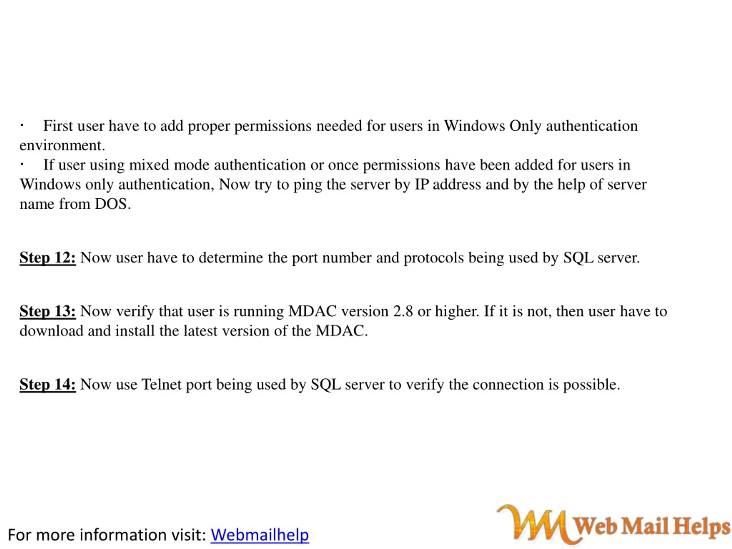 ·First user have to add proper permissions needed for users in Windows Only authentication environment. ·If user using mixed mode authentication or once permissions have been added for users in Windows only authentication, Now try to ping the server by IP address and by the help of server name from DOS. Step 12: Now user have to determine the port number and protocols being used by SQL server. Step 13: Now verify that user is running MDAC version 2.8 or higher. If it is not, then user have to download and install the latest version of the MDAC. Step 14: Now use Telnet port being used by SQL server to verify the connection is possible. For more information visit: Webmailhelp