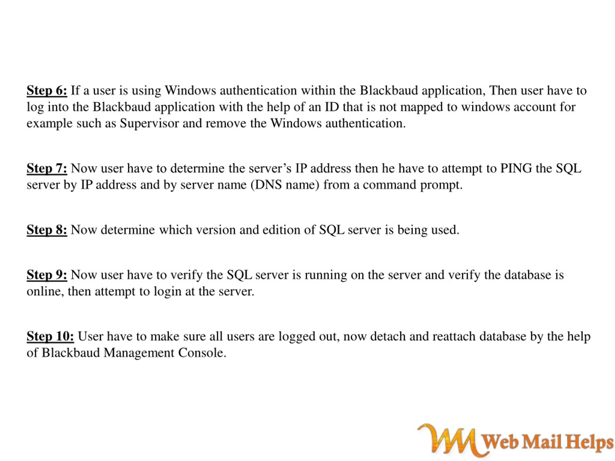 Step 6: If a user is using Windows authentication within the Blackbaud application, Then user have to log into the Blackbaud application with the help of an ID that is not mapped to windows account for example such as Supervisor and remove the Windows authentication. Step 7: Now user have to determine the server’s IP address then he have to attempt to PING the SQL server by IP address and by server name (DNS name) from a command prompt. Step 8: Now determine which version and edition of SQL server is being used. Step 9: Now user have to verify the SQL server is running on the server and verify the database is online, then attempt to login at the server. Step 10: User have to make sure all users are logged out, now detach and reattach database by the help of Blackbaud Management Console.
