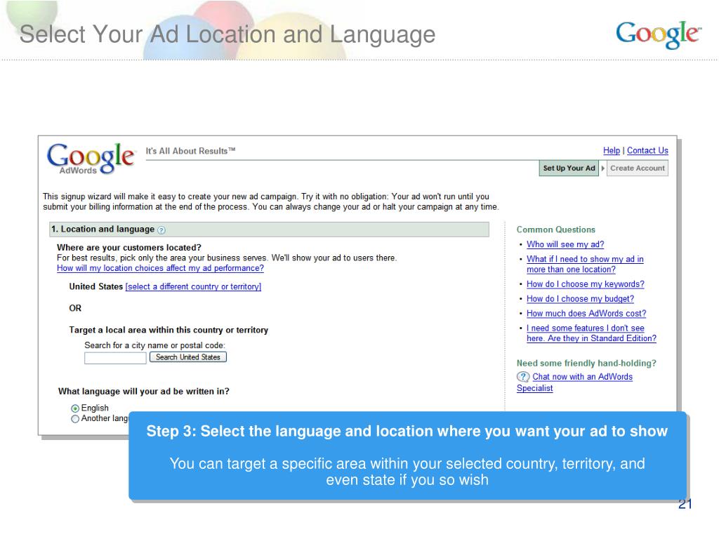 Select Your Ad Location and Language Step 3: Select the language and location where you want your ad to show You can target a specific area within your selected country, territory, and even state if you so wish