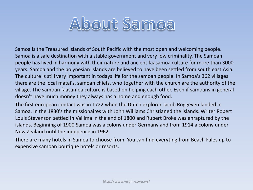 About Samoa Samoa is the Treasured Islands of South Pacific with the most open and welcoming people. Samoa is a safe destination with a stable government and very low criminality. The Samoan people has lived in harmony with their nature and ancient faasamoa culture for more than 3000 years. Samoa and the polynesian Islands are believed to have been settled from south east Asia. The culture is still very important in todays life for the samoan people. In Samoa's 362 villages there are the local matai's, samoan chiefs, who together with the church are the authority of the village. The samoanfaasamoa culture is based on helping each other. Even if samoans in general doesn't have much money they always has a home and enough food. The first european contact was in 1722 when the Dutch explorer Jacob Roggeven landed in Samoa. In the 1830's the missionaires with John Williams Christianed the islands. Writer Robert Louis Stevenson settled in Vailima in the end of 1800 and Rupert Broke was enraptured by the islands. Beginning of 1900 Samoa was a colony under Germany and from 1914 a colony under New Zealand until the indepence in 1962. There are many hotels in Samoa to choose from. You can find everyting from Beach Fales up to expensive samoan boutique hotels or resorts. http://www.virgin-cove.ws/