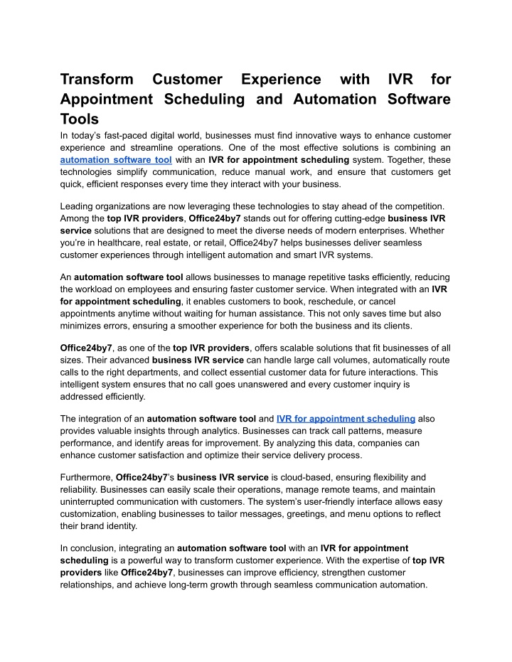 1. Transform Appointment Scheduling and Automation Software Tools In today’s fast-paced digital world, businesses must find innovative ways to enhance customer experience and streamline operations. One of the most effective solutions is combining an automation software tool with an IVR for appointment scheduling system. Together, these technologies simplify communication, reduce manual work, and ensure that customers get quick, efficient responses every time they interact with your business. Customer Experience with IVR for Leading organizations are now leveraging these technologies to stay ahead of the competition. Among the top IVR providers, Office24by7 stands out for offering cutting-edge business IVR service solutions that are designed to meet the diverse needs of modern enterprises. Whether you’re in healthcare, real estate, or retail, Office24by7 helps businesses deliver seamless customer experiences through intelligent automation and smart IVR systems. An automation software tool allows businesses to manage repetitive tasks efficiently, reducing the workload on employees and ensuring faster customer service. When integrated with an IVR for appointment scheduling, it enables customers to book, reschedule, or cancel appointments anytime without waiting for human assistance. This not only saves time but also minimizes errors, ensuring a smoother experience for both the business and its clients. Office24by7, as one of the top IVR providers, offers scalable solutions that fit businesses of all sizes. Their advanced business IVR service can handle large call volumes, automatically route calls to the right departments, and collect essential customer data for future interactions. This intelligent system ensures that no call goes unanswered and every customer inquiry is addressed efficiently. The integration of an automation software tool and IVR for appointment scheduling also provides valuable insights through analytics. Businesses can track call patterns, measure performance, and identify areas for improvement. By analyzing this data, companies can enhance customer satisfaction and optimize their service delivery process. Furthermore, Office24by7’s business IVR service is cloud-based, ensuring flexibility and reliability. Businesses can easily scale their operations, manage remote teams, and maintain uninterrupted communication with customers. The system’s user-friendly interface allows easy customization, enabling businesses to tailor messages, greetings, and menu options to reflect their brand identity. In conclusion, integrating an automation software tool with an IVR for appointment scheduling is a powerful way to transform customer experience. With the expertise of top IVR providers like Office24by7, businesses can improve efficiency, strengthen customer relationships, and achieve long-term growth through seamless communication automation.
