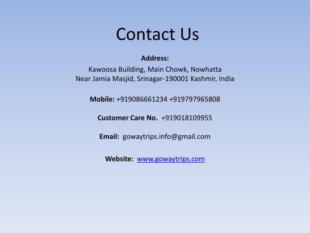 Contact Us Address: Kawoosa Building, Main Chowk, Nowhatta Near Jamia Masjid, Srinagar-190001 Kashmir, India Mobile: +919086661234 +919797965808Customer Care No. +919018109955Email: gowaytrips.info@gmail.com Website: www.gowaytrips.com