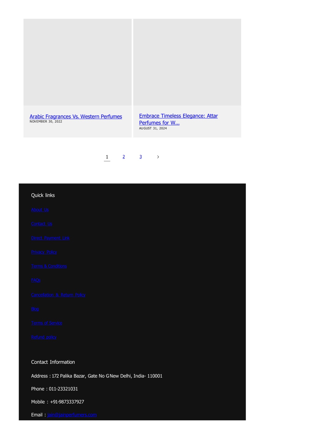 1 2 3 Quicklinks AboutUsContactUs DirectPaymentLinkPrivacyPolicyTerms&ConditionsFAQs Cancellation&ReturnPolicyBlog TermsofServiceRefundpolicy ContactInformation Address:172PalikaBazar, GateNoGNewDelhi,India-110001 Phone:011-23321031 Mobile:+91-9873337927 Email:jain@jainperfumers.com
