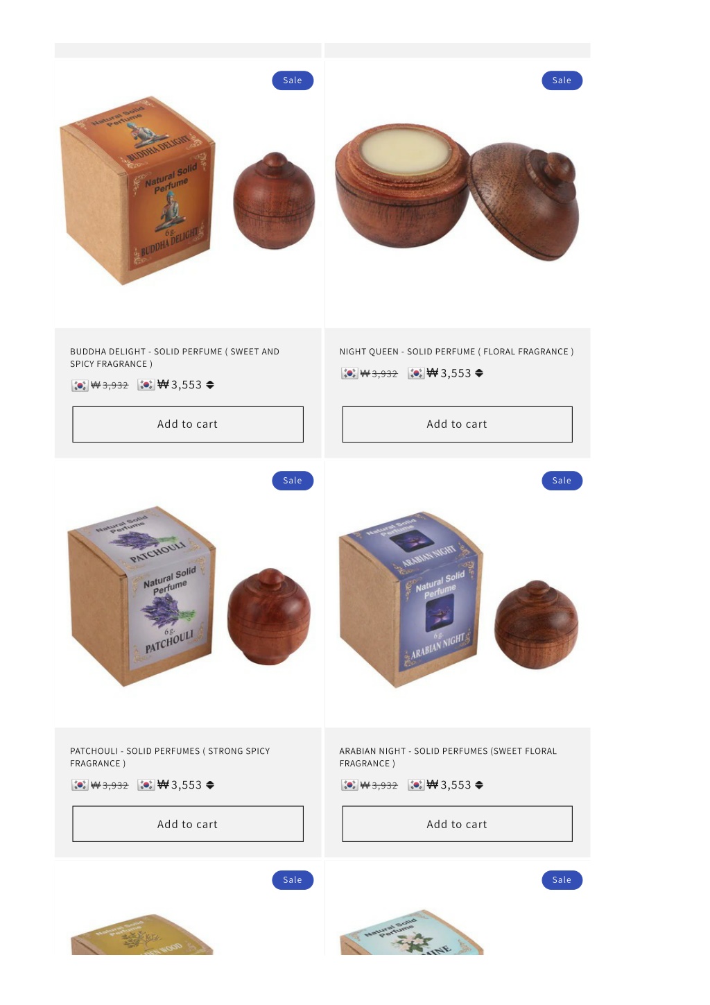 3. Sale Sale BUDDHA DELIGHT - SOLID PERFUME ( SWEET AND SPICY FRAGRANCE ) NIGHT QUEEN - SOLID PERFUME ( FLORAL FRAGRANCE ) ₩ 3,932 ₩3,553 ₩ 3,932 ₩3,553 Add to cart Add to cart Sale Sale PATCHOULI - SOLID PERFUMES ( STRONG SPICY FRAGRANCE ) ARABIAN NIGHT - SOLID PERFUMES (SWEET FLORAL FRAGRANCE ) ₩ 3,932 ₩3,553 ₩ 3,932 ₩3,553 Add to cart Add to cart Sale Sale