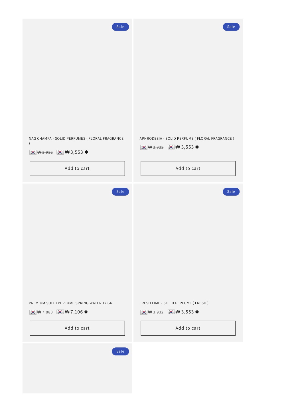 5. Sale Sale NAG CHAMPA - SOLID PERFUMES ( FLORAL FRAGRANCE ) APHRODESIA - SOLID PERFUME ( FLORAL FRAGRANCE ) ₩ 3,932 ₩3,553 ₩ 3,932 ₩3,553 Add to cart Add to cart Sale Sale PREMIUM SOLID PERFUME SPRING WATER 12 GM FRESH LIME - SOLID PERFUME ( FRESH ) ₩ 7,880 ₩7,106 ₩ 3,932 ₩3,553 Add to cart Add to cart Sale