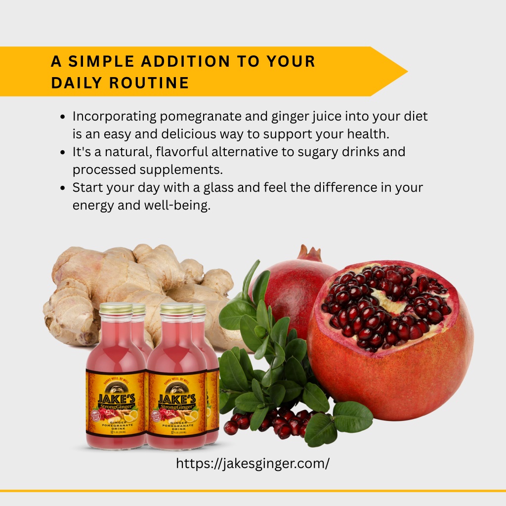 A SIMPLE ADDITION TO YOUR DAILY ROUTINE Incorporating pomegranate and ginger juice into your diet is an easy and delicious way to support your health. It's a natural, flavorful alternative to sugary drinks and processed supplements. Start your day with a glass and feel the difference in your energy and well-being. https://jakesginger.com/