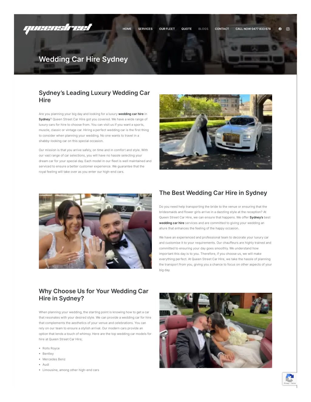 AtQueenStreetCarHire,wearefullyaccreditedandqualifiedtodeliverAtQueenStreetCarHire,wearefullyaccreditedandqualifiedtodeliver qualitytoourclients.Sinceourinception,wehaveaimedtoensurethatour clientsaresatisfiedwithourservices.Thatiswhyweensureyoumakethe rightchoiceforyourtransportation.Wealsounderstandthebudget constraintsyoumustfacewhenplanningyourwedding.Assuch,wekeep thepriceforourweddingcarhiresinSydneyascompetitiveaspossible. WeareSydney’smostawardedweddingcarhireprovider.Therefore,youcanrestassuredof qualityservicesthatreflectyourlifestyle. RequestMoreInformation CallNow:0283810592 Terms&Conditions|Services ©2022QueenStreet.Allrightsreserved Privacy - Terms