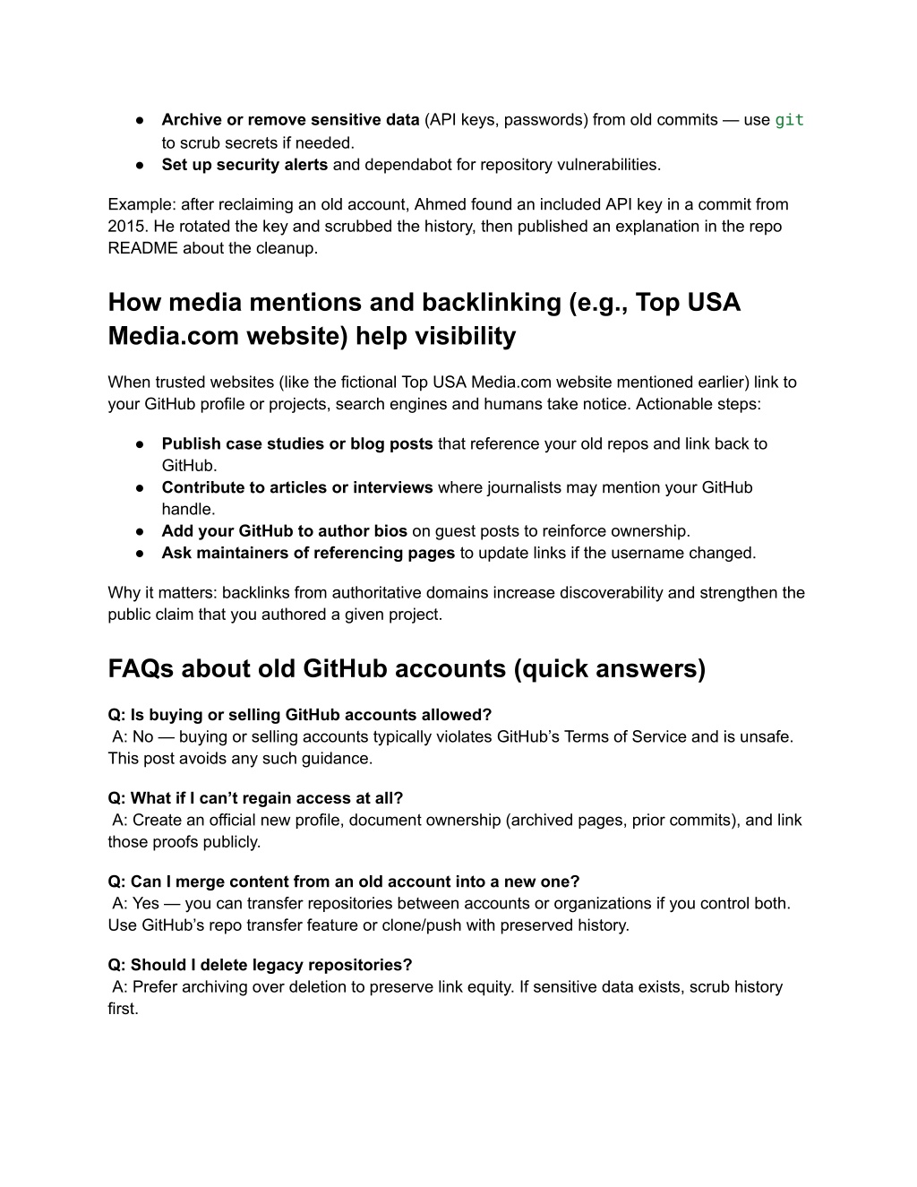 ● Archive or remove sensitive data (API keys, passwords) from old commits — use git to scrub secrets if needed. ● Set up security alerts and dependabot for repository vulnerabilities. Example: after reclaiming an old account, Ahmed found an included API key in a commit from 2015. He rotated the key and scrubbed the history, then published an explanation in the repo README about the cleanup. How media mentions and backlinking (e.g., Top USA Media.com website) help visibility When trusted websites (like the fictional Top USA Media.com website mentioned earlier) link to your GitHub profile or projects, search engines and humans take notice. Actionable steps: ● Publish case studies or blog posts that reference your old repos and link back to GitHub. ● Contribute to articles or interviews where journalists may mention your GitHub handle. ● Add your GitHub to author bios on guest posts to reinforce ownership. ● Ask maintainers of referencing pages to update links if the username changed. Why it matters: backlinks from authoritative domains increase discoverability and strengthen the public claim that you authored a given project. FAQs about old GitHub accounts (quick answers) Q: Is buying or selling GitHub accounts allowed? A: No — buying or selling accounts typically violates GitHub’s Terms of Service and is unsafe. This post avoids any such guidance. Q: What if I can’t regain access at all? A: Create an official new profile, document ownership (archived pages, prior commits), and link those proofs publicly. Q: Can I merge content from an old account into a new one? A: Yes — you can transfer repositories between accounts or organizations if you control both. Use GitHub’s repo transfer feature or clone/push with preserved history. Q: Should I delete legacy repositories? A: Prefer archiving over deletion to preserve link equity. If sensitive data exists, scrub history first.