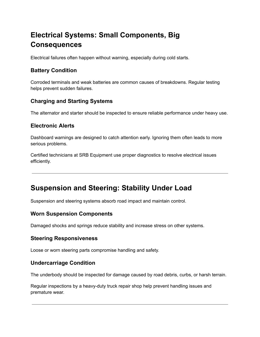 Electrical Systems: Small Components, Big Consequences Electrical failures often happen without warning, especially during cold starts. Battery Condition Corroded terminals and weak batteries are common causes of breakdowns. Regular testing helps prevent sudden failures. Charging and Starting Systems The alternator and starter should be inspected to ensure reliable performance under heavy use. Electronic Alerts Dashboard warnings are designed to catch attention early. Ignoring them often leads to more serious problems. Certified technicians at SRB Equipment use proper diagnostics to resolve electrical issues efficiently. Suspension and Steering: Stability Under Load Suspension and steering systems absorb road impact and maintain control. Worn Suspension Components Damaged shocks and springs reduce stability and increase stress on other systems. Steering Responsiveness Loose or worn steering parts compromise handling and safety. Undercarriage Condition The underbody should be inspected for damage caused by road debris, curbs, or harsh terrain. Regular inspections by a heavy-duty truck repair shop help prevent handling issues and premature wear.