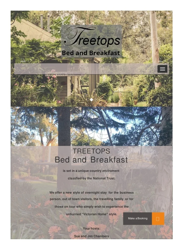 TREETOPS Bed andBreakfast is set in a unique country enviroment classfied by the NationalTrust. We offer a new style of overnight stay for thebusiness person, out of town visitors, the travelling family or for those on tour who simply wish to experience the unhurried "Victorian Home"style. Make aBooking Yourhosts: Sue and JimChambers