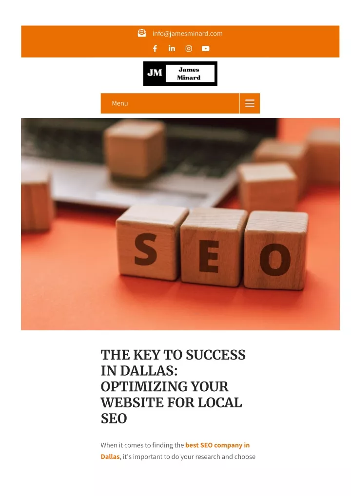 info@jamesminard.com Menu THE KEY TO SUCCESS IN DALLAS: OPTIMIZING YOUR WEBSITE FOR LOCAL SEO When it comes to 몭nding the best SEO company in Dallas, it’s important to do your research and choose