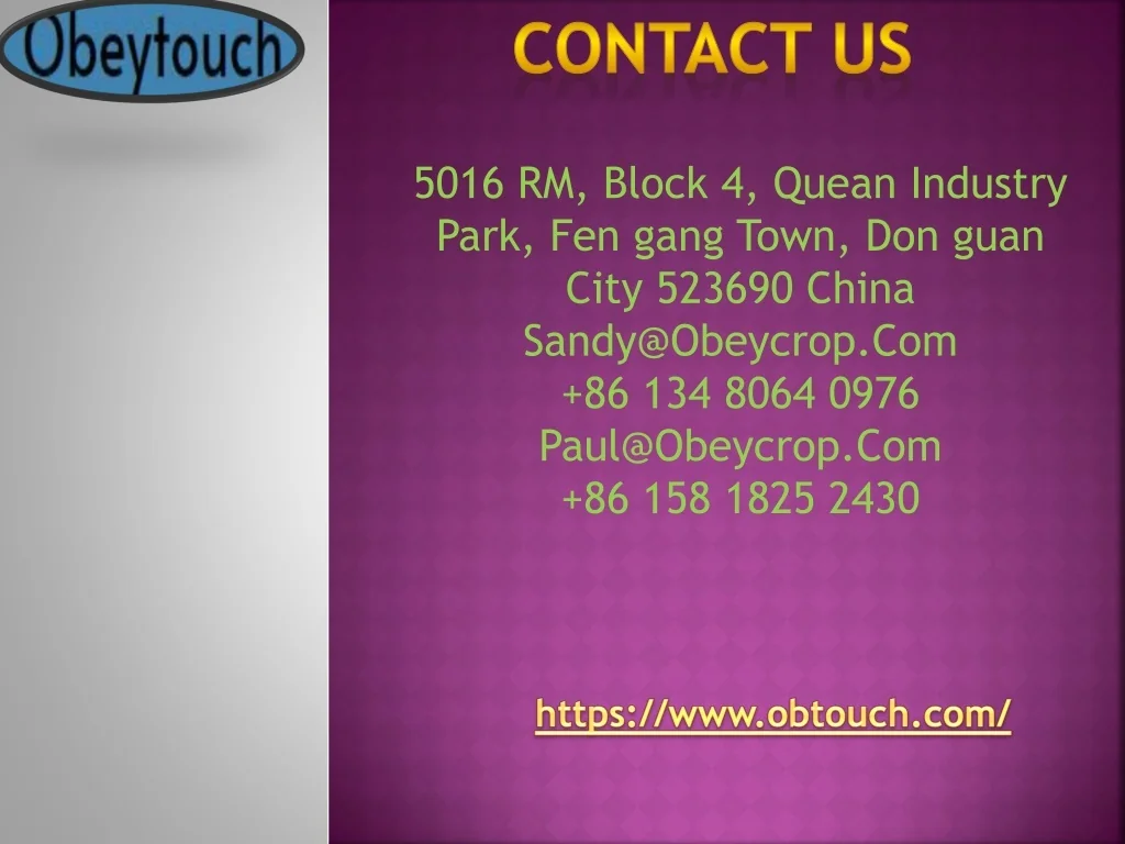 Contact us 5016 RM, Block 4, Quean Industry Park, Fen gang Town, Don guan City 523690 China Sandy@Obeycrop.Com +86 134 8064 0976 Paul@Obeycrop.Com +86 158 1825 2430 https://www.obtouch.com/