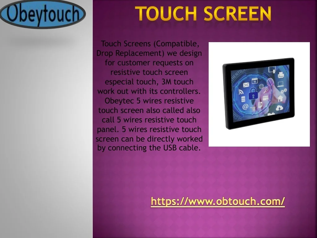 Touch Screen Touch Screens (Compatible, Drop Replacement) we design for customer requests on resistive touch screen especial touch, 3M touch work out with its controllers. Obeytec 5 wires resistive touch screen also called also call 5 wires resistive touch panel. 5 wires resistive touch screen can be directly worked by connecting the USB cable. https://www.obtouch.com/