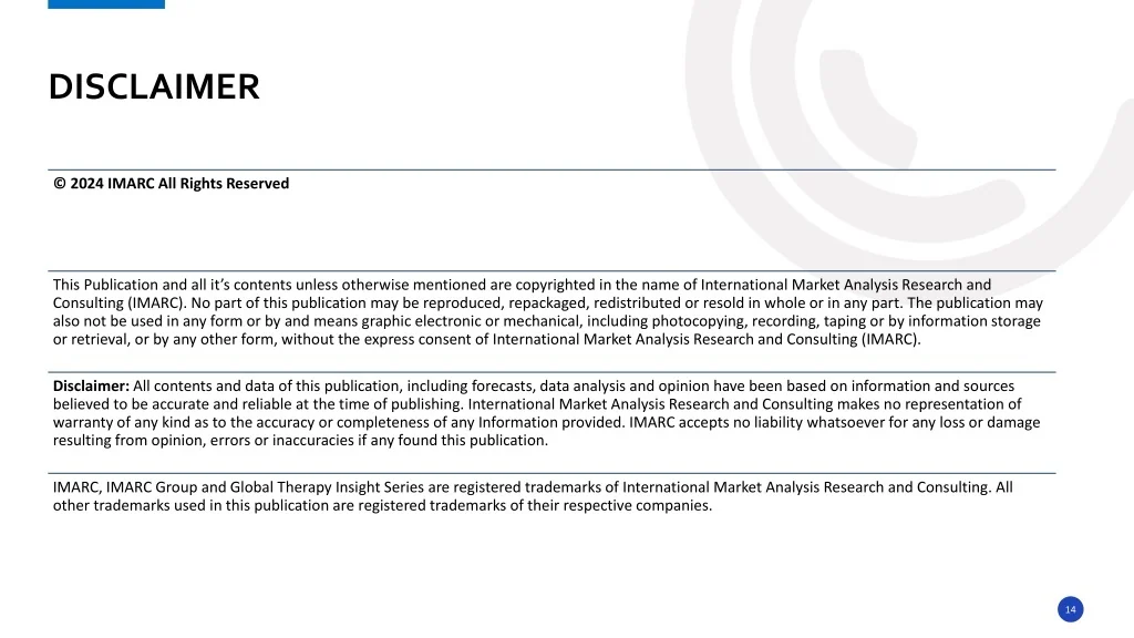 DISCLAIMER © 2024 IMARC All Rights Reserved This Publication and all it’s contents unless otherwise mentioned are copyrighted in the name of International Market Analysis Research and Consulting (IMARC). No part of this publication may be reproduced, repackaged, redistributed or resold in whole or in any part. The publication may also not be used in any form or by and means graphic electronic or mechanical, including photocopying, recording, taping or by information storage or retrieval, or by any other form, without the express consent of International Market Analysis Research and Consulting (IMARC). Disclaimer: All contents and data of this publication, including forecasts, data analysis and opinion have been based on information and sources believed to be accurate and reliable at the time of publishing. International Market Analysis Research and Consulting makes no representation of warranty of any kind as to the accuracy or completeness of any Information provided. IMARC accepts no liability whatsoever for any loss or damage resulting from opinion, errors or inaccuracies if any found this publication. IMARC, IMARC Group and Global Therapy Insight Series are registered trademarks of International Market Analysis Research and Consulting. All other trademarks used in this publication are registered trademarks of their respective companies. 14