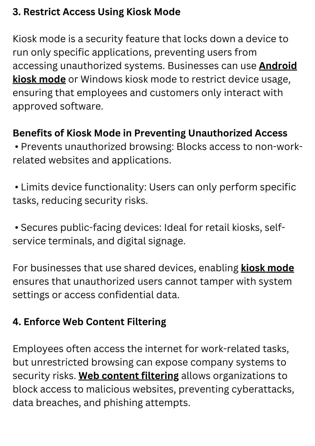 3. Restrict Access Using Kiosk Mode Kiosk mode is a security feature that locks down a device to run only specific applications, preventing users from accessing unauthorized systems. Businesses can use Android kiosk mode or Windows kiosk mode to restrict device usage, ensuring that employees and customers only interact with approved software. Benefits of Kiosk Mode in Preventing Unauthorized Access • Prevents unauthorized browsing: Blocks access to non-work- related websites and applications. • Limits device functionality: Users can only perform specific tasks, reducing security risks. • Secures public-facing devices: Ideal for retail kiosks, self- service terminals, and digital signage. For businesses that use shared devices, enabling kiosk mode ensures that unauthorized users cannot tamper with system settings or access confidential data. 4. Enforce Web Content Filtering Employees often access the internet for work-related tasks, but unrestricted browsing can expose company systems to security risks. Web content filtering allows organizations to block access to malicious websites, preventing cyberattacks, data breaches, and phishing attempts.